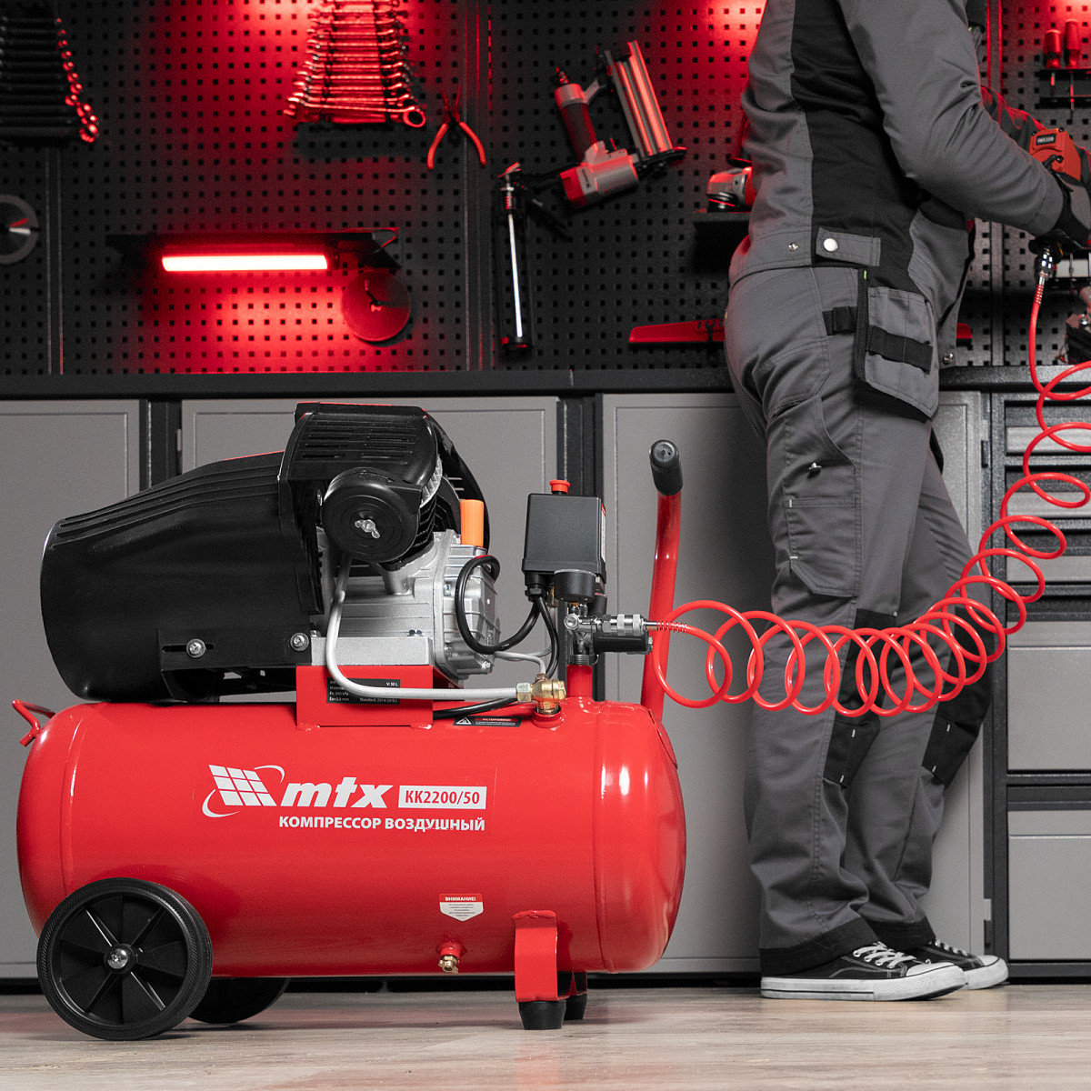 Компрессор воздушный масляный MTX KK-2200/50 58024 мощностью 2,2 кВт, с прямым приводом, оснащен ресивером объемом 50 л, обеспечивает производительность на уровне 350 л/мин и рассчитан на давление до 8 бар. Предназначен для обеспечения работоспособности пневматического инструмента: гайковерта, шлифовальной машины, шуруповерта, краскораспылителя или т.д. Мощный и производительный компрессор будет полезен на строительной площадке, в гараже, на предприятии автосервиса.