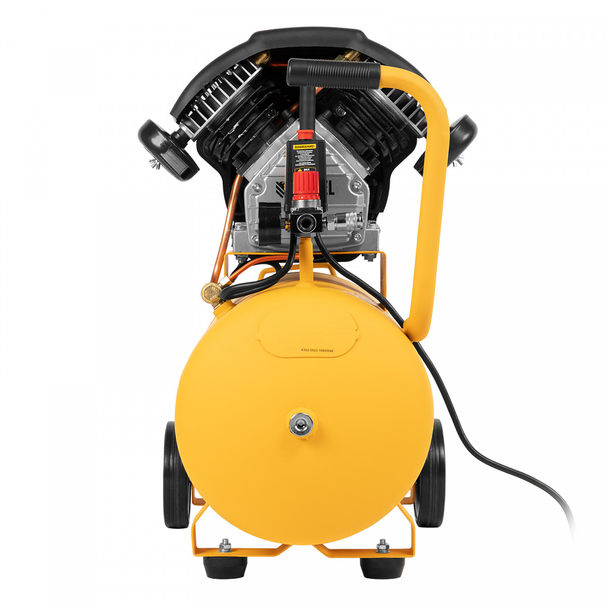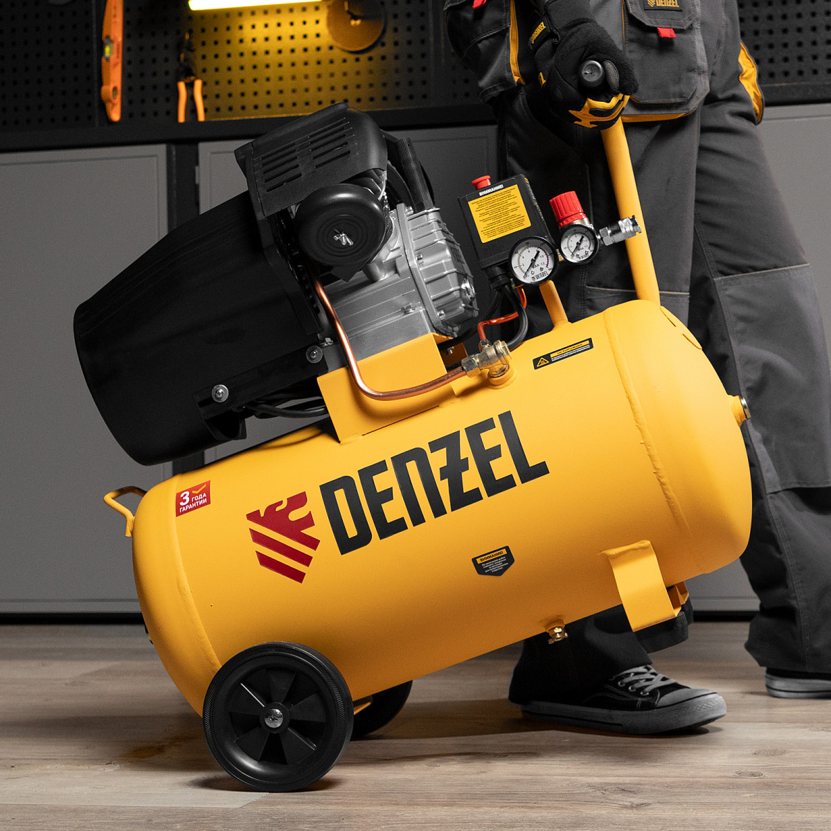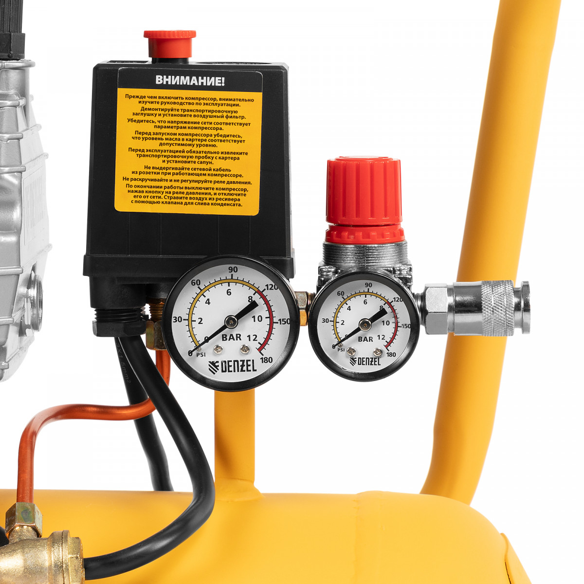 • Контроль давления и расхода воздуха — компрессор оснащен регулятором и двумя манометрами.
