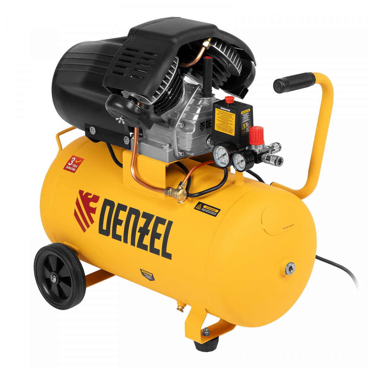 Воздушный компрессор с прямым приводом Denzel DCV1800/50 58168 мощностью 1,8 кВт и производительностью на входе 320 л/мин, с объемом ресивера 50 л, подходит для обеспечения длительной работы пневмогайковерта, пневмозубила, пневмодрели, пневмомолотка или другого пневмоинструмента. Быстроразъемные коннекторы Рапид (Евро) облегчают подключение пневмомагистралей. Эффективная система смазки снижает износ деталей и уменьшает нагрузку на двигатель, что позволяет использовать компрессор в профессиональной сфере.