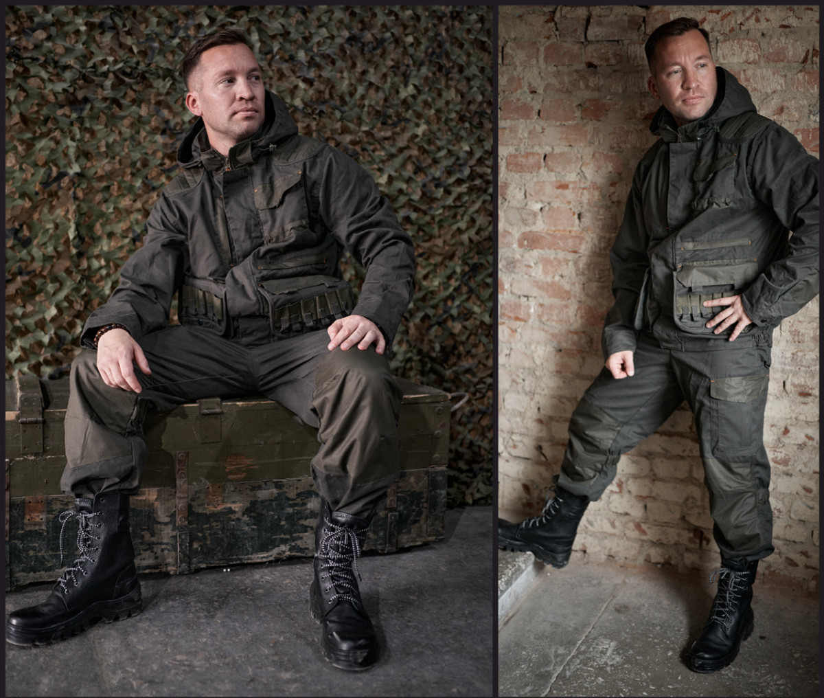 Куртка имеет свободный крой, что позволяет пододеть термобелье в прохладную погоду. Брюки прямого кроя имеют утягивающую сборку под коленями, что помогает легко передвигаться по любой местности. При этом на куртке и брюках есть регулировки по объему, которые позволяют подогнать костюм под индивидуальные потребности.