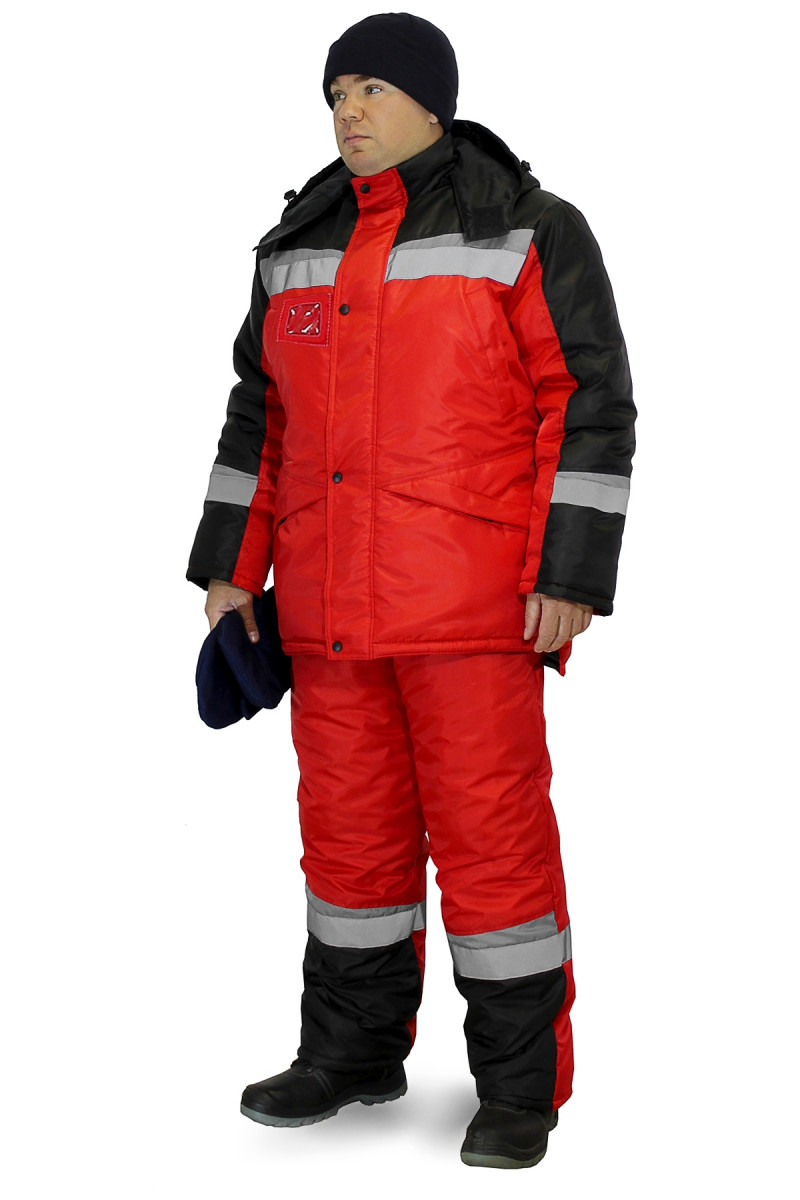 Мужской костюм, состоящий из куртки и полукомбинезона, обеспечивает надежную защиту от низких температур и ветра. Верх изделий выполнен из прочной, износостойкой ткани с водоотталкивающей пропиткой. В качестве утеплителя используется синтепон. Для обозначения работника в темное время суток на куртке и брючинах предусмотрены светоотражающие элементы. Куртка классического кроя с удлиненной спинкой имеет застежку в виде толстой молнии, которая закрыта планкой с кнопками и контактной лентой. По талии объем изделия можно отрегулировать с помощью кулисы. Капюшон снимается (крепление на молнии) и регулируется по объему. Высокий воротник, утепленный флисом, обеспечивает дополнительную защиту от ветра. На рукавах манжеты из трикотажной ткани. На куртке расположено 4 утепленных кармана с лицевой стороны (верхние врезные и нижние накладного типа с клапанами) и 1 внутренний. На груди справа есть специальная вставка для пропуска или личной карточки.