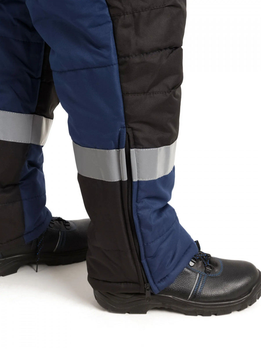 Костюм состоит из куртки и полукомбинезона. Куртка со светоотражающими полосами и кантом, с центральной застежкой на молнию, ветрозащитным клапаном на текстильную застежку с чередованием кнопок и внутреннюю планку с уголком для защиты подбородочной части от молнии. Воротник стойка, с внутренней стороны флис, съемный утепленный капюшон. На правой полочке нагрудный карман для бейджа. Рукава с внутренними трикотажными манжетами. Полукомбинезон со светоотражающими полосами , с центральной застежкой на молнию и планку на текстильную застежку, на регулируемых по длине бретелях. На правой передней половинке нагрудный карман для сотового телефона. Состав: 100% полиэстер Ткань: Taslan 228 Milky PU, пл.135 г. Ткань из 100% нейлона с нанесением полиуретанового покрытия Подкладка: Таффета 190Т Утеплитель куртка - синтепон 2 слоя по 150 г., Termofinn 150г.; полукомбез - синтепон 150 г., Termofinn 150г. Защита 3 класс защиты, lV и особый климатический пояс ГОСТ Р 12.4.236-2011
