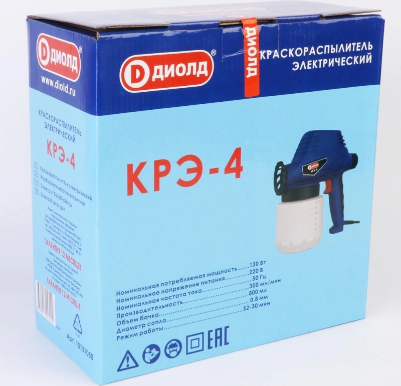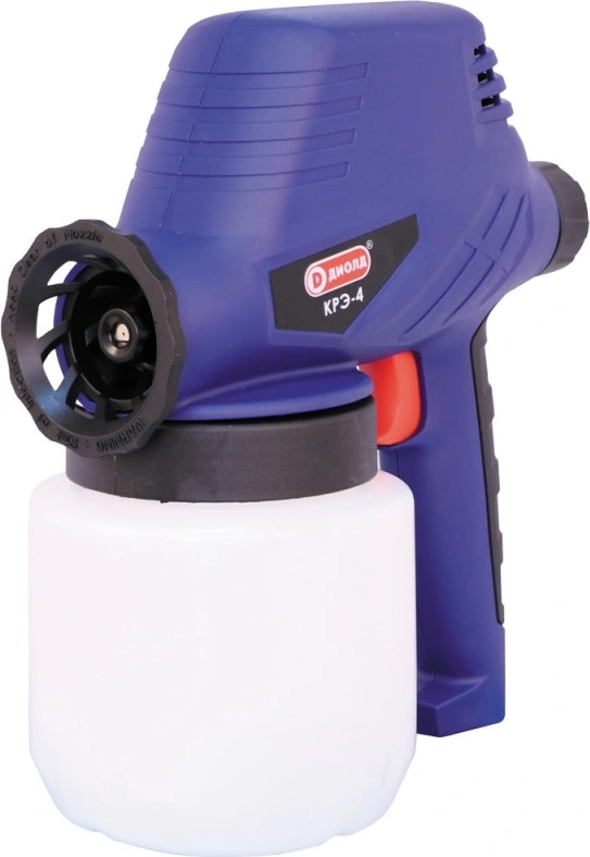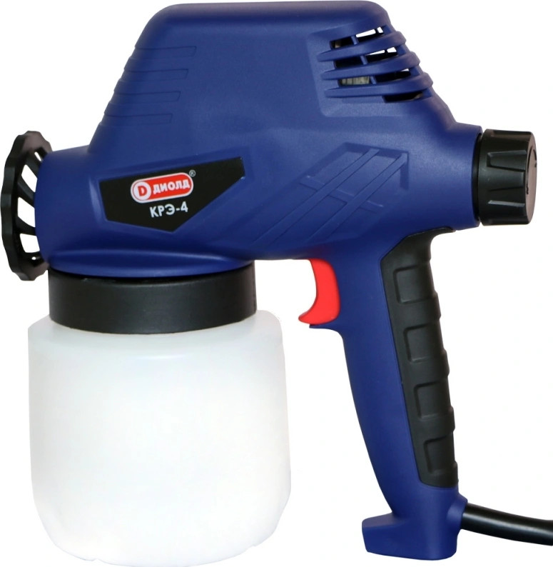 Электрический краскораспылитель ДИОЛД КРЭ-4 10131050 предназначен для нанесения красок, эмульсий и растворов на различные поверхности.
