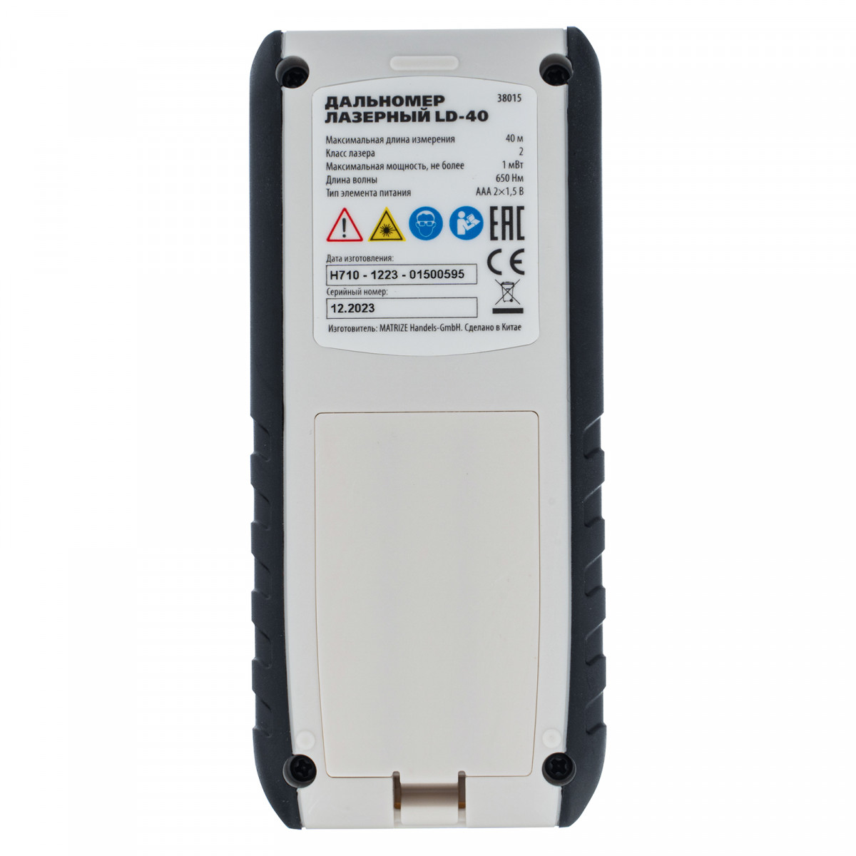 Лазерный дальномер Matrix LD-40 38015 с электронным угломером применяется для вычисления площади и объема помещения, замера углов и определения длины до 40 м. Для ускорения и облегчения работы предусмотрена возможность складывания и вычитания полученных результатов. Прибор можно использовать как в помещении, так и на улице, поэтому он подходит для проведения строительных, ремонтных, отделочных, а также дорожных и геодезических работ.