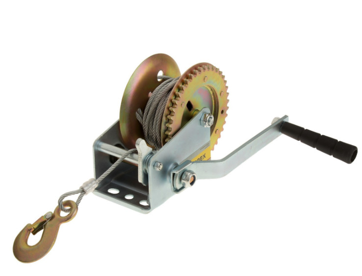 Канатная лебедка с храповым тормозом (0.55 т, канат 10 м) TOPEX 97X085 оснащается крюком, который крепится к канату через специальную петлю. Храповый механизм значительно упрощает подъем грузов. Использование лебедки допускается в домашних условиях при перемещении объектов весом до 550 килограммов