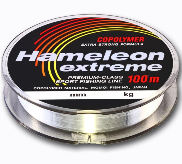 Рыболовная леска Hameleon Extreme от японской компании Momoi Fishing разработана для экстремальных условий. Повышенная прочность на узле позволяет выдерживать длительные нагрузки. Специальное абразивное покрытие увеличивает износоустойчивость лески. Специальное покрытие Hameleon (хамелеон) снижает видимость лески в воде.
