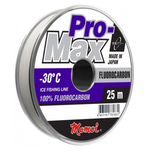 Основным плюсом в пользу лески из 100% флюорокарбона японской компании Momoi можно назвать ее невидимость в воде благодаря такому полезному качеству, как низкий коэффициент преломления солнечных лучей. С другой стороны, флюорокарбон не впитывает воду и имеет минимальную растяжимость. Эти критерии также очень важны в условиях зимней рыбалки, благодаря им леска становится более чувствительной к поклевке. Благодаря техническим характеристикам материала, флюорокарбоновая леска более тяжелая, чем обычная, поэтому она быстрее тонет и ведет себя более статично в воде. Инженеры Momoi добились того, чтобы прочностные характеристики Pro-Max Fluorocarbon были высокими и была возможность использовать леску в качестве поводков. Данная леска предназначена для зимней ловли при температуре до -30⁰С.