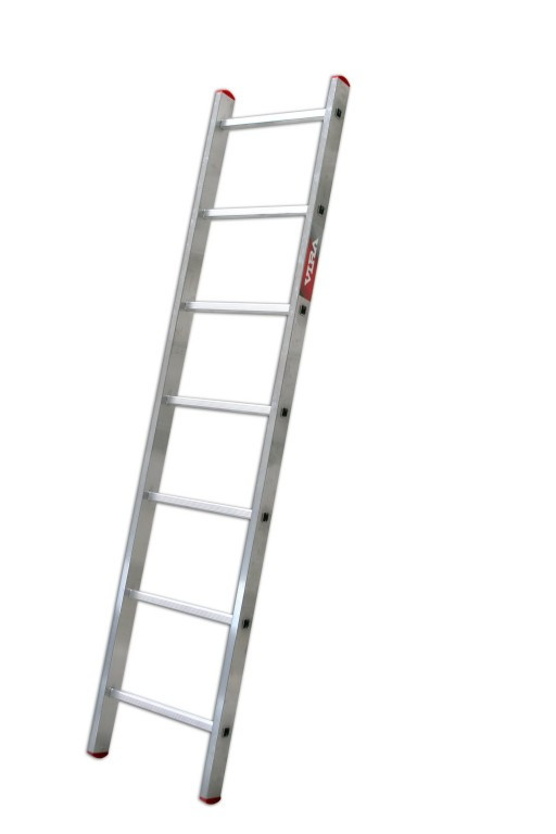 "Пприставная лестница.Технические преимущества:максимальная прочность и надёжность при небольшом весе изделия, стойки и ступени изготовлены из прессованного профиля, многократная развальцовка в соединении ступеней со стойками обеспечивает высокую прочность и долговечность, рифлёные ступени с шагом 260 мм для безопасного подъёма и спуска, надёжно закреплённые в стойках пластиковые наконечники препятствуют скольжению
