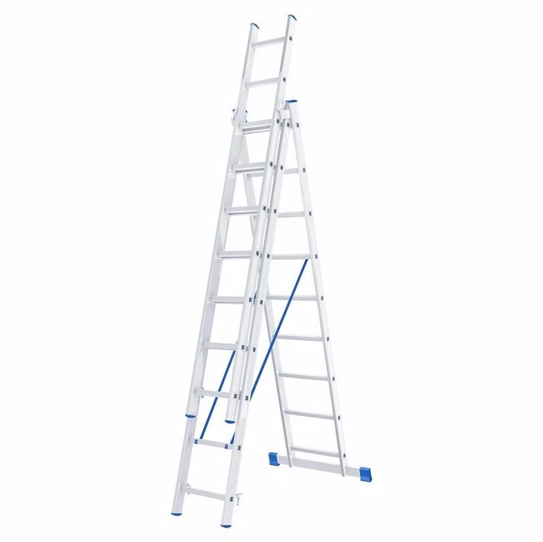 Алюминиевая трехсекционная лестница СИБРТЕХ 3х9 ступеней 97819 применяется для высотных работ, как покраска фасада дома, монтирование электроосветительных приборов, работа в саду и др. Трансформируется в четыре различные формы и подходит для выполнения работ на высоте до 4.7 м. Защиту от скольжения на рабочих поверхностях обеспечивают заглушки и широкая траверса.