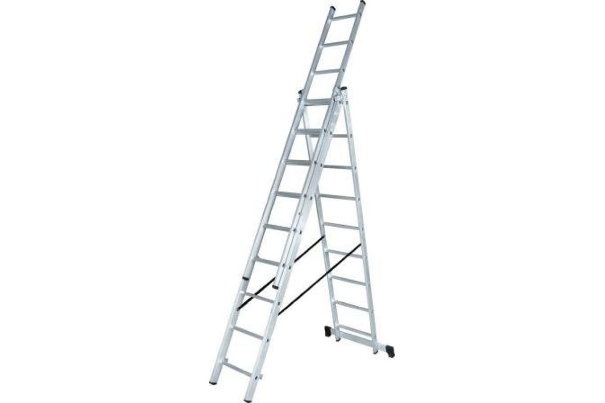 Алюминиевая трёхсекционная лестница имеют возможность трансформироваться, в зависимости от выполняемых работ. Выдерживает нагрузку до 150 кг.Широта применения. Модель может использоваться в качестве стремянки, стремянки с выдвижной третьей секцией, приставной лестницы.Коррозиестойкость. Алюминий позволяет применять её как внутри помещения, так и на открытой рабочей площадке.Против скольжения. Благодаря пластиковым наконечникам ножек модель не скользит по рабочей площадке.Компактность. Лестница занимает мало места при хранении.Повышенная устойчивость. Поперечная траверса надежно фиксирует лестницу на поверхности.