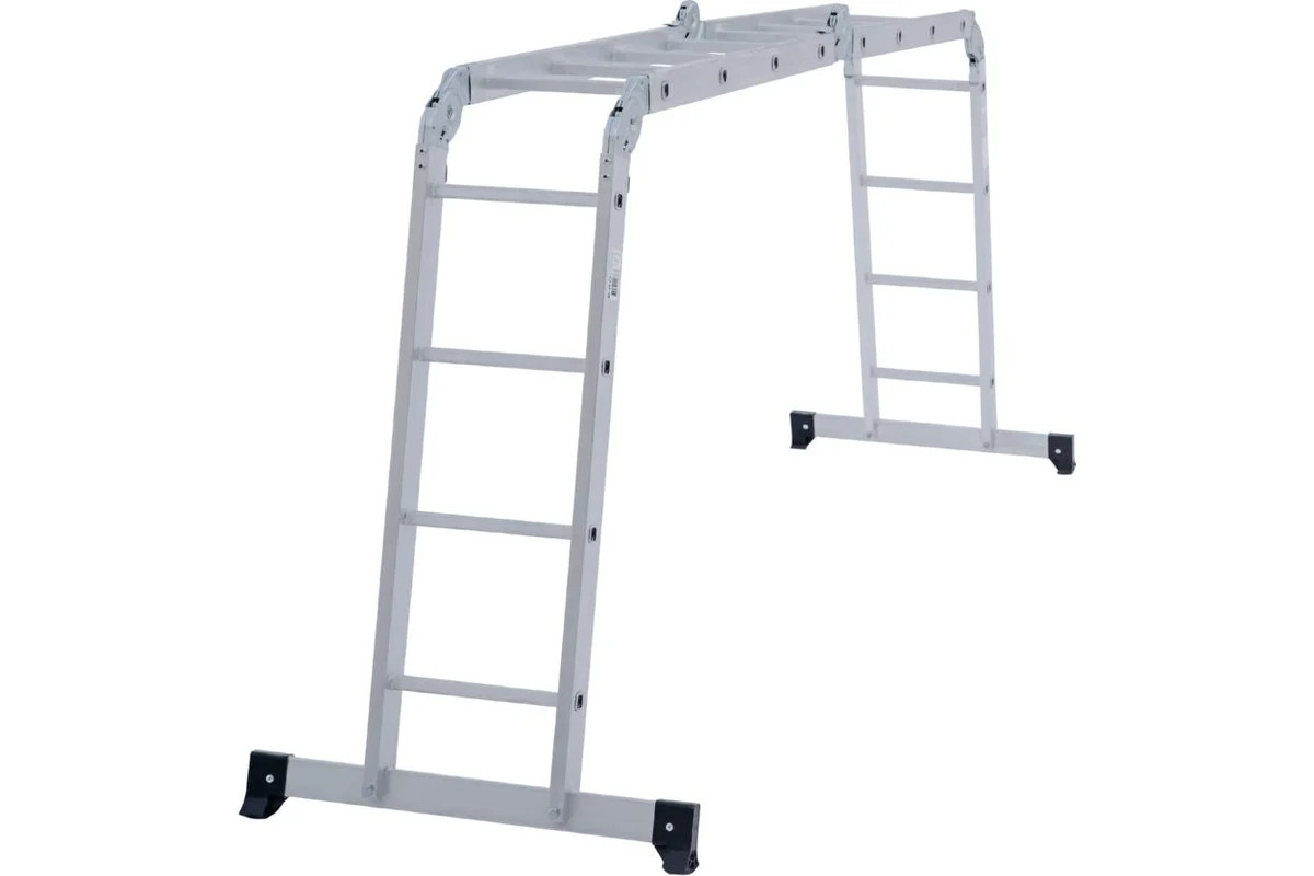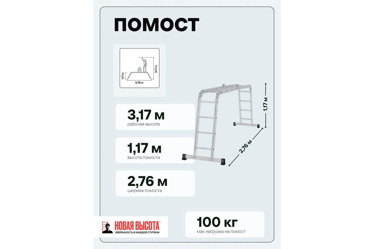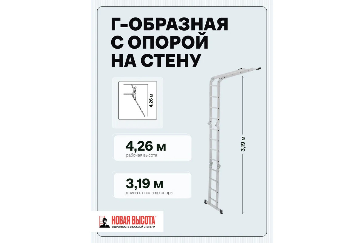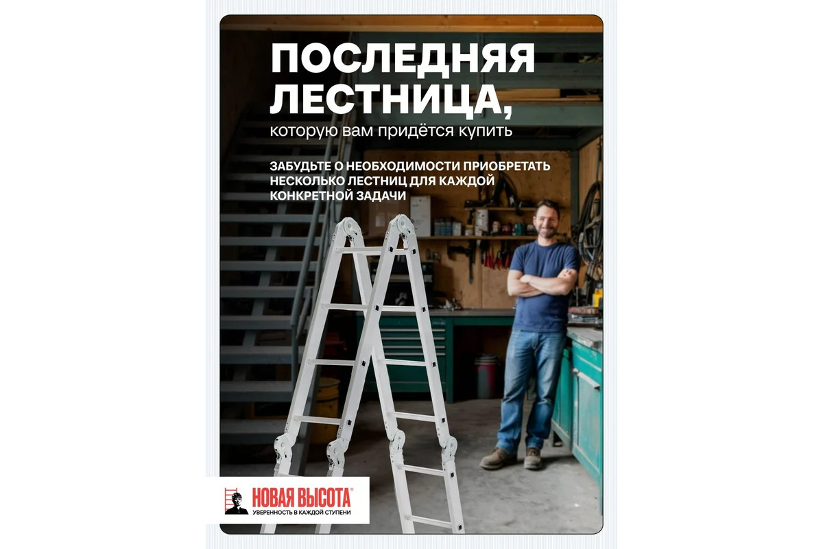 Четырехсекционная лестница-трансформер Новая Высота 4х4 1320404 отличается универсальностью, компактностью при хранении, устойчивостью. Легко преобразуется в помост-платформу, стремянку, приставную лестницу, лестницу с выносом.  Максимально допустимая нагрузка в положении помост 100 кг.