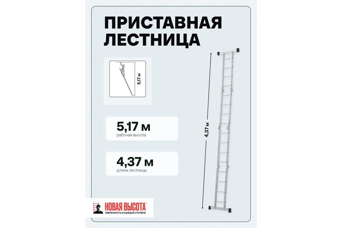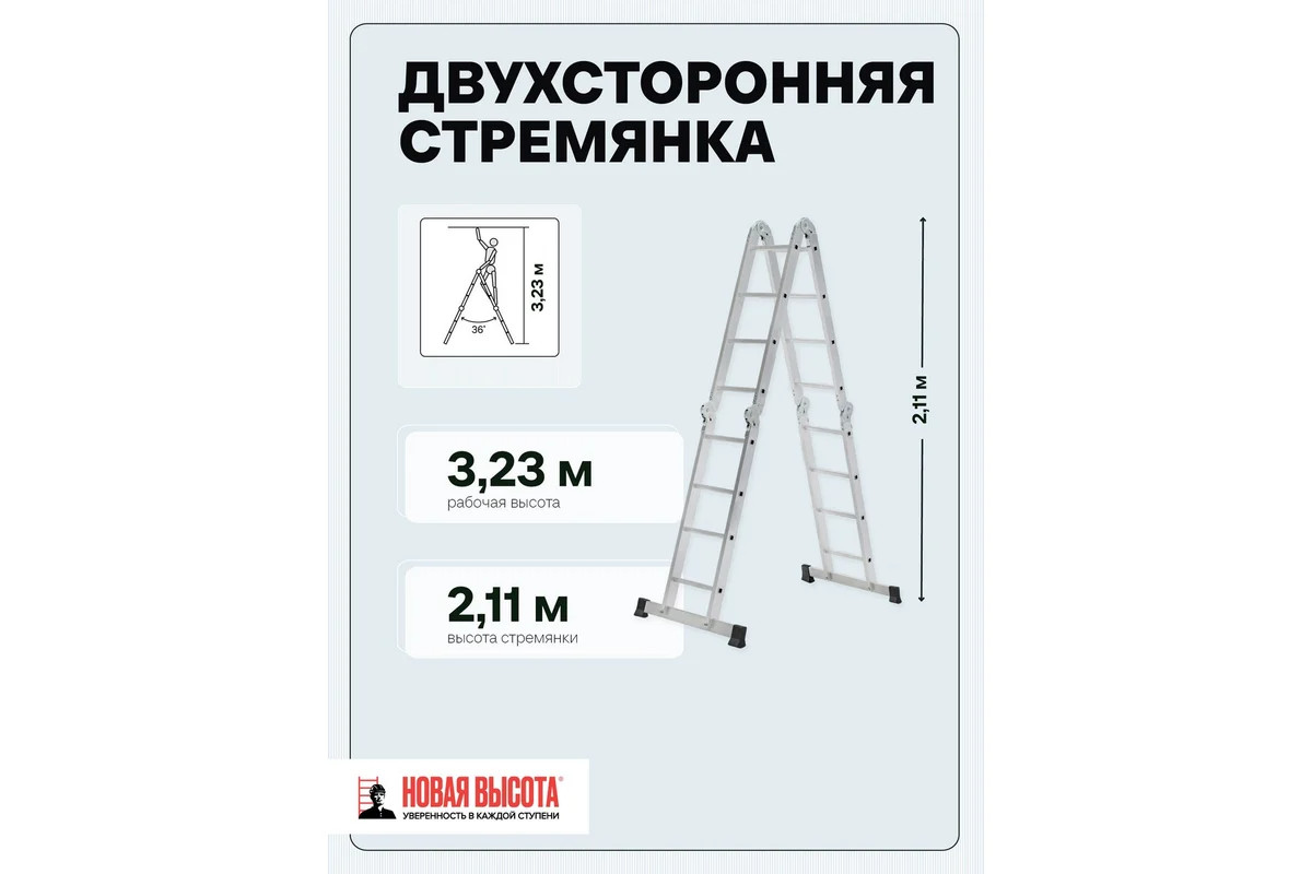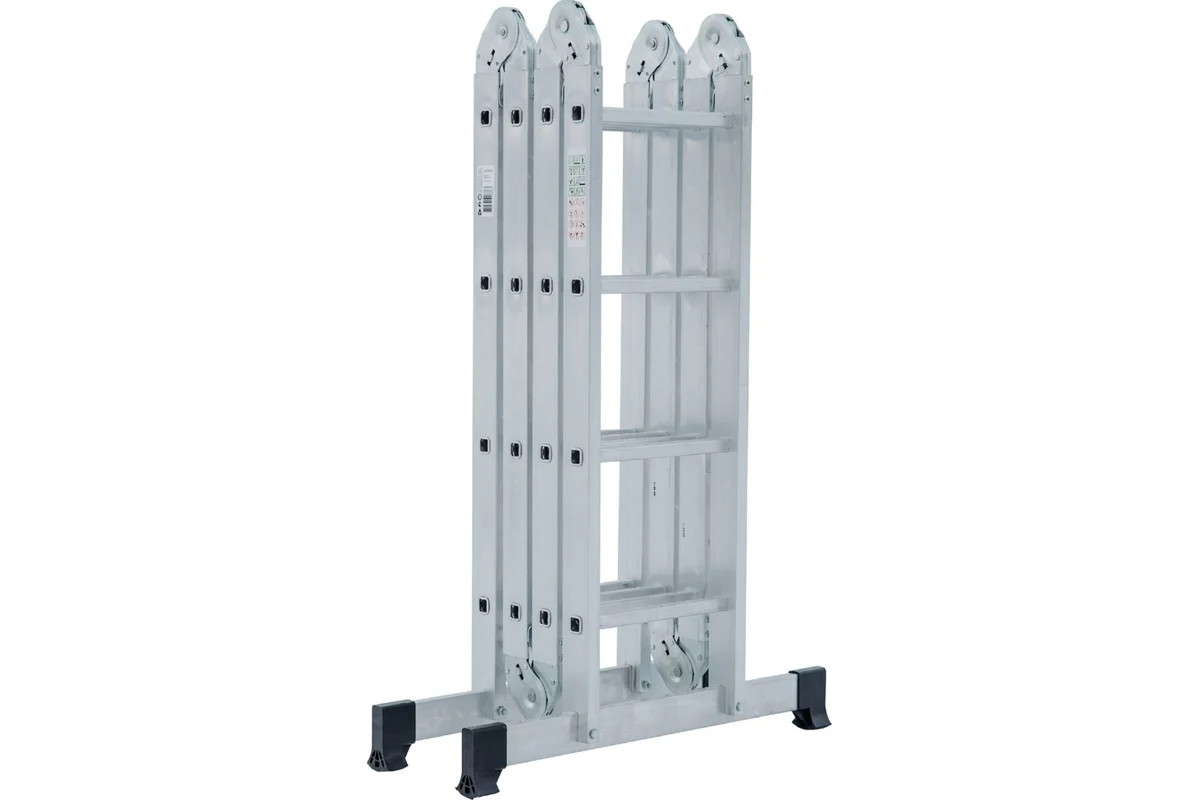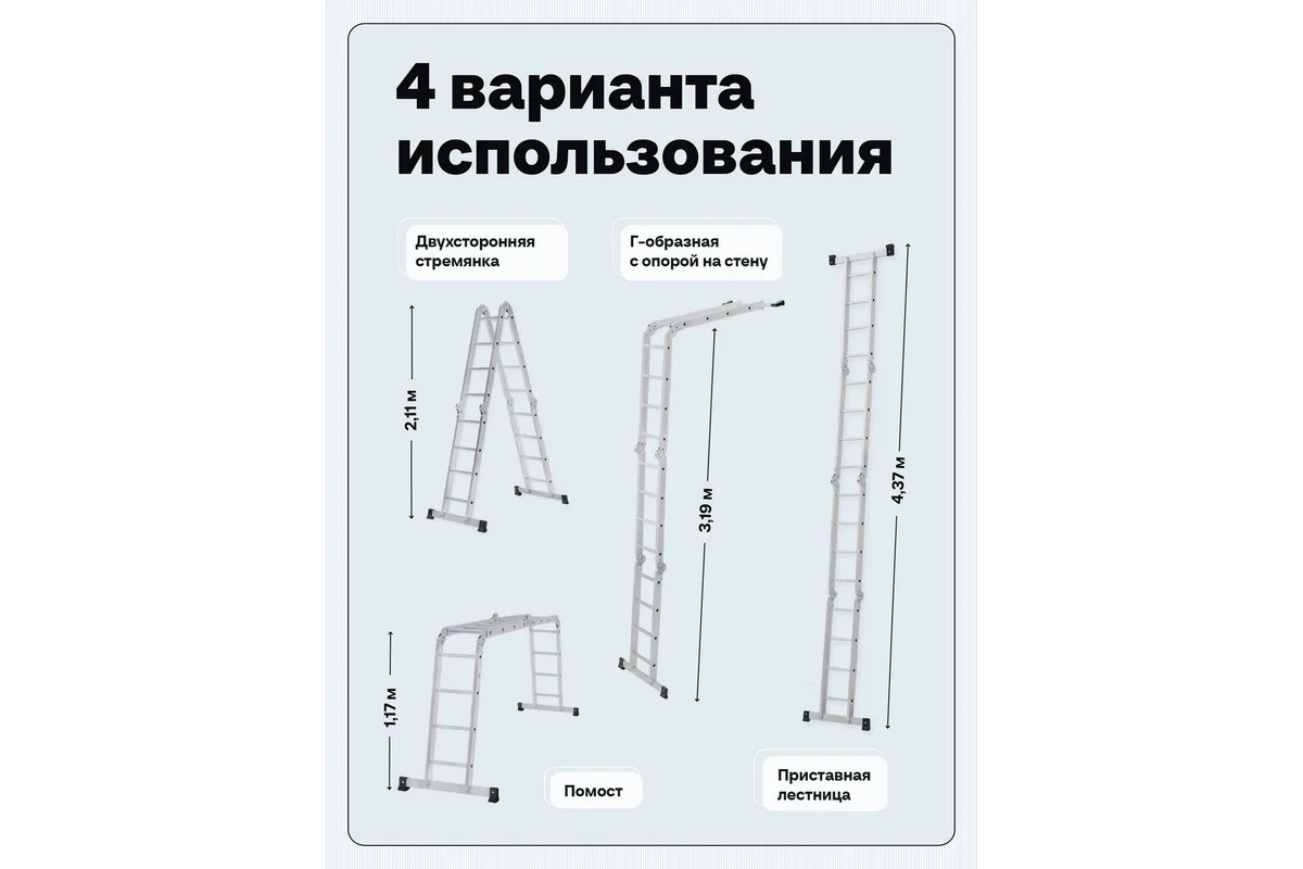 Четырехсекционная лестница-трансформер Новая Высота 4х4 1320404 отличается универсальностью, компактностью при хранении, устойчивостью. Легко преобразуется в помост-платформу, стремянку, приставную лестницу, лестницу с выносом.  Максимально допустимая нагрузка в положении помост 100 кг.