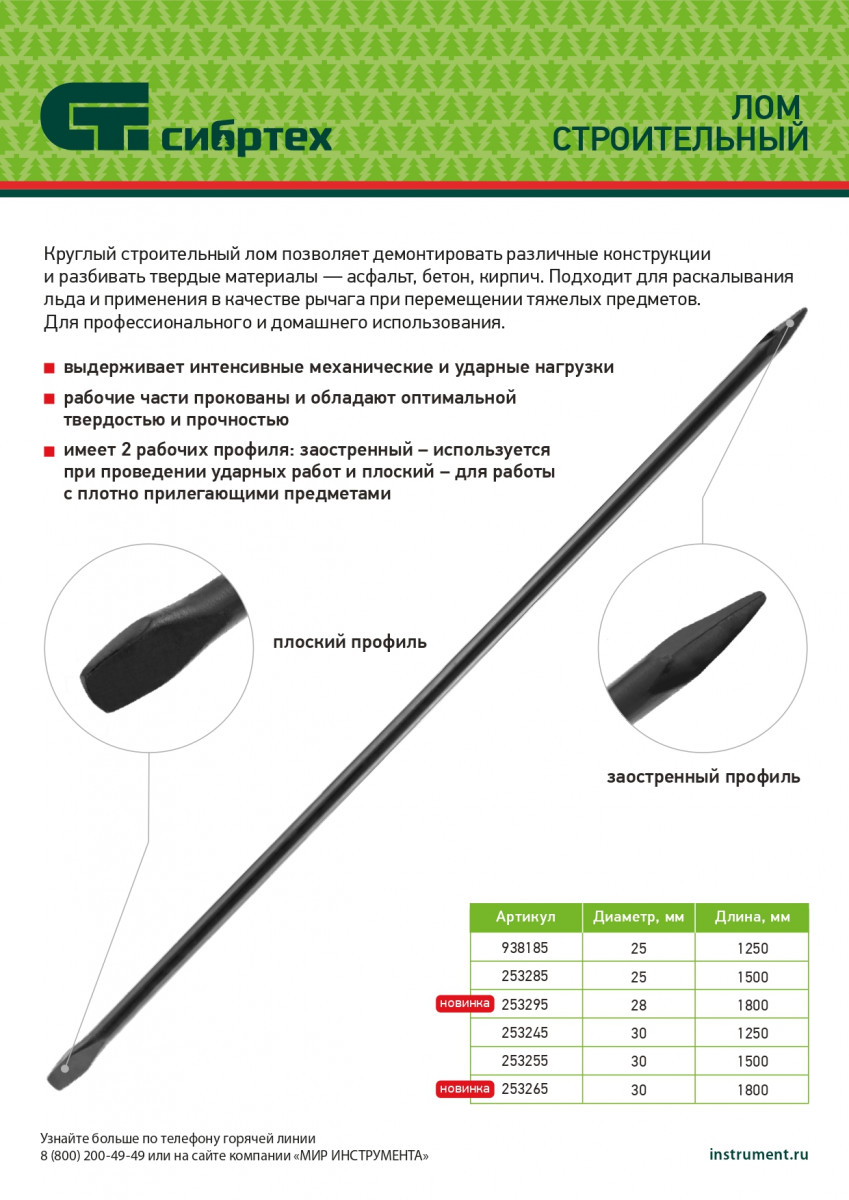 Лом строительный, D 25 мм, L 1500 мм, круглый Сибртех
