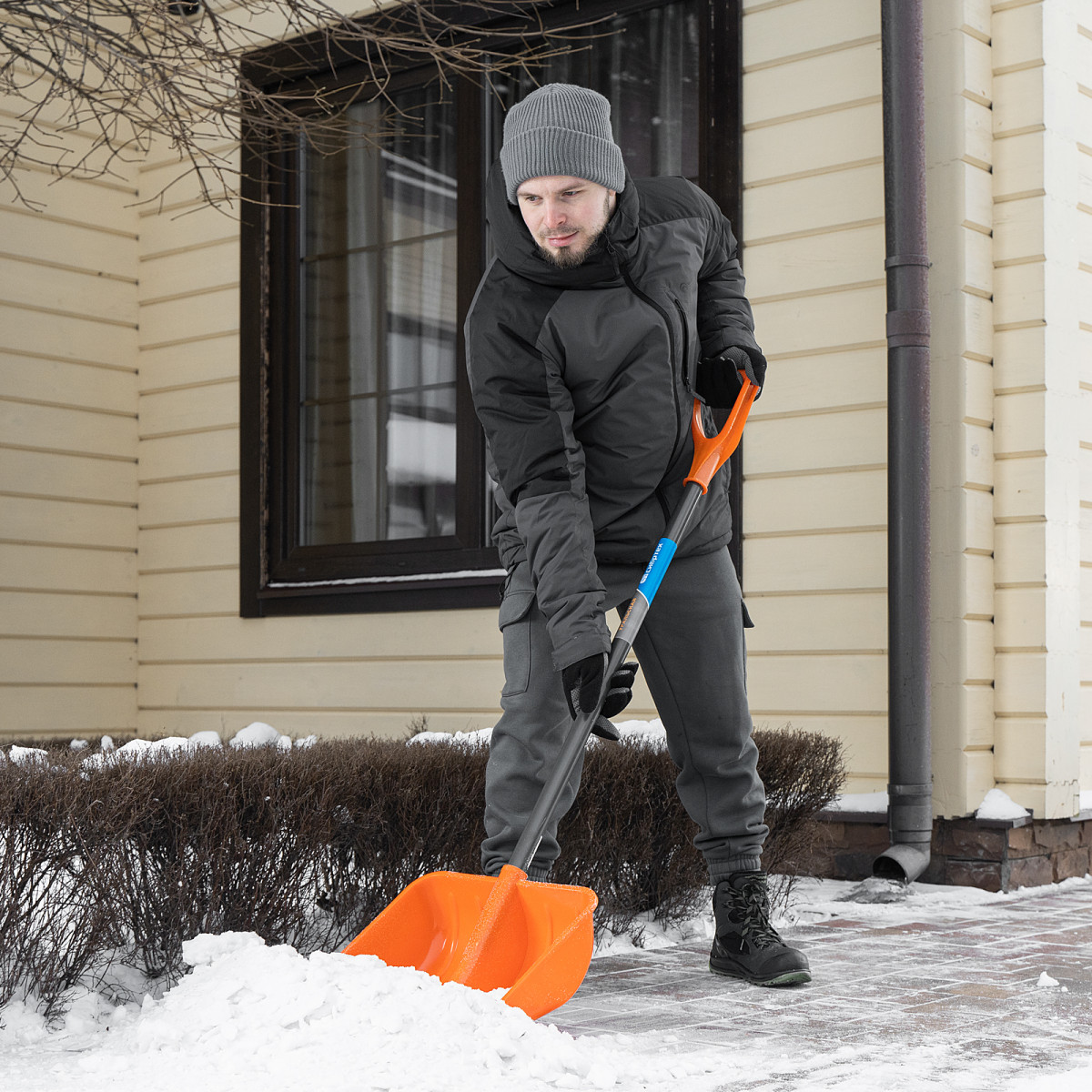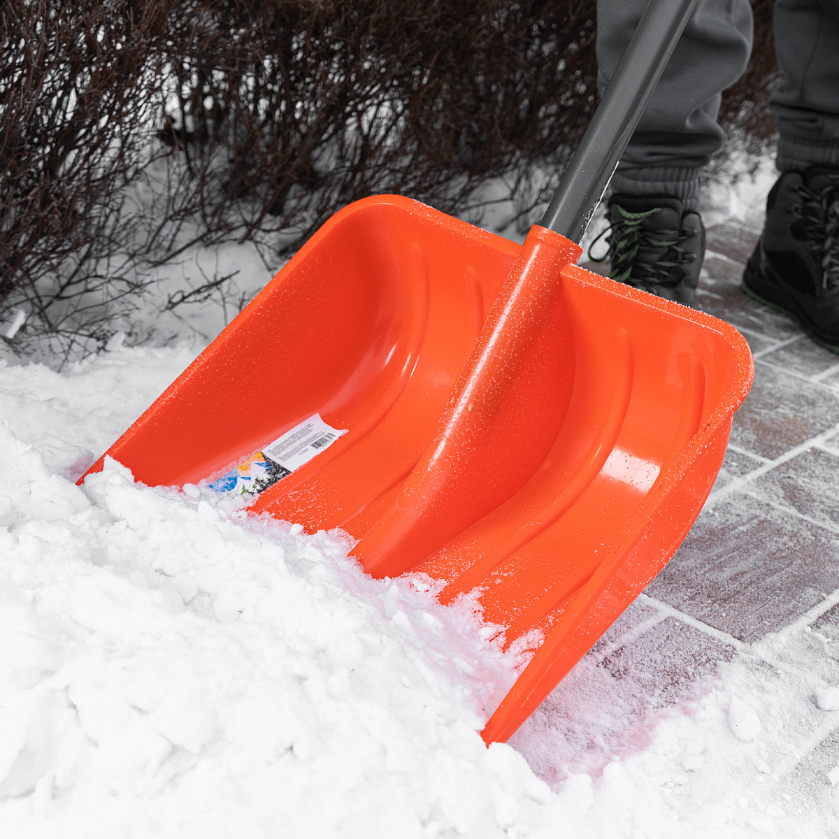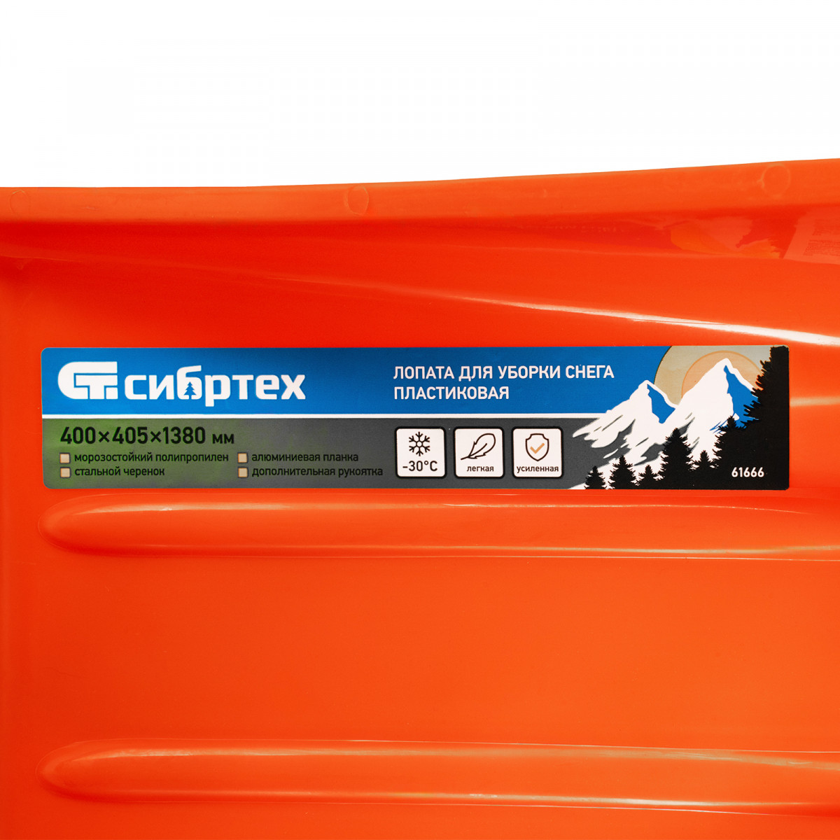 Пластиковая лопата Сибртех 61666 размером 400 х 405 х 1380 мм, со стальным черенком, используется для уборки снега на занесенных дорожках, тротуарах, подъездных путях. Вместительный усиленный ковш с высокими бортиками позволяет быстро справиться с работой.