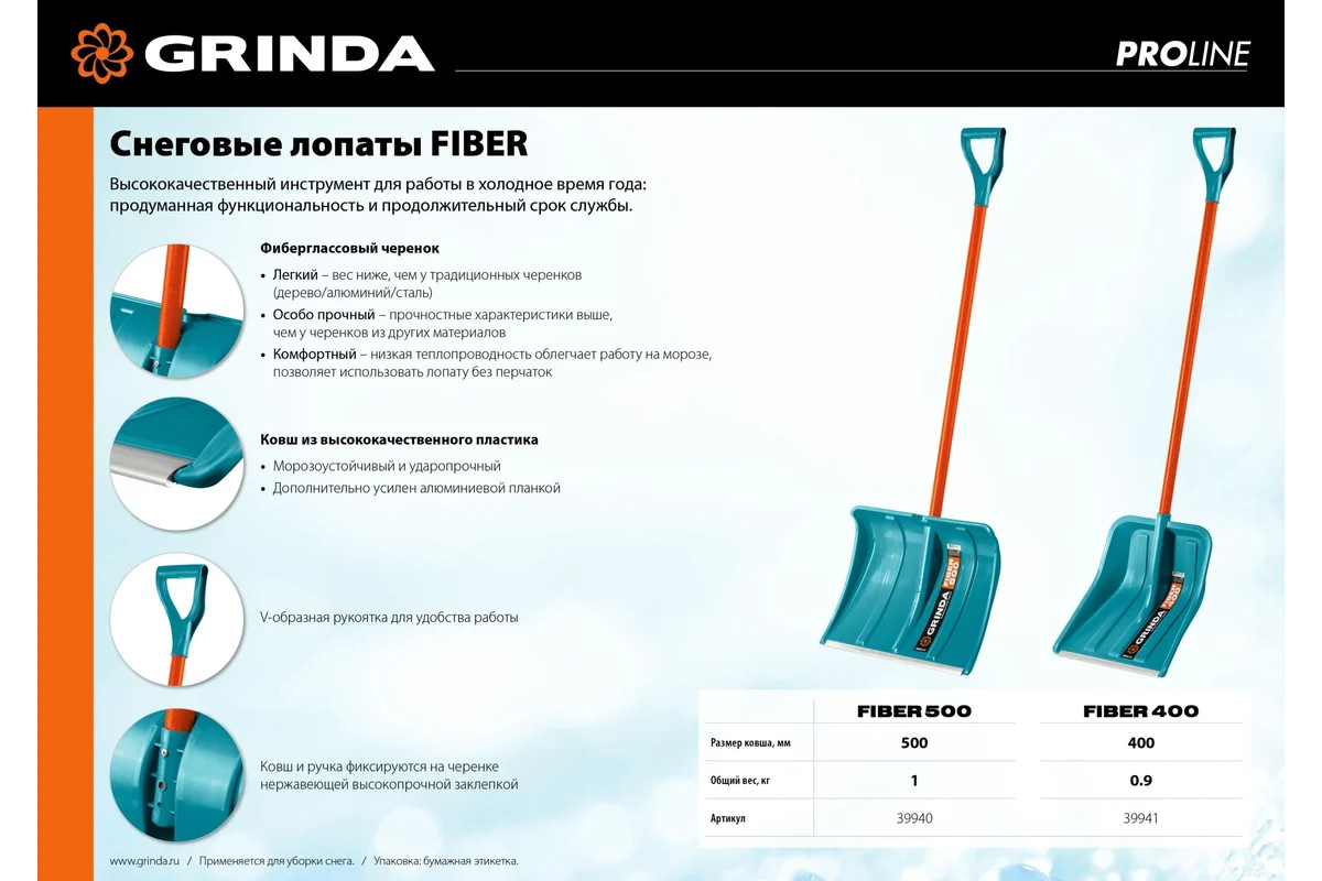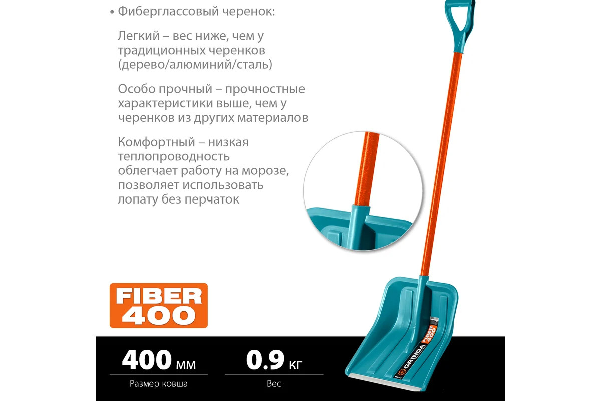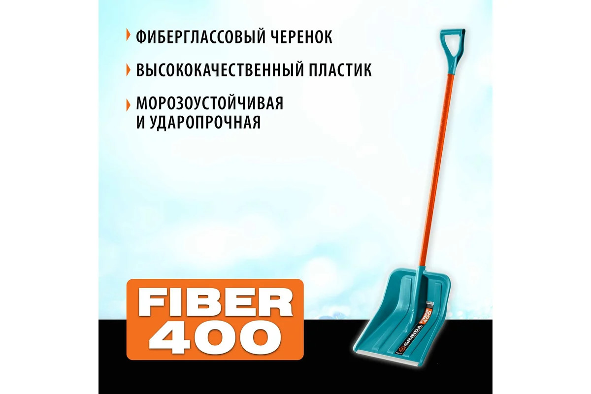 Пластиковая снеговая лопата Grinda PROLine Fiber-400 400 мм 39941 подходит для очистки территории от снега. Этот высококачественный инструмент создан специально для работы в холодное время года и сочетает в себе продуманную функциональность и продолжительный срок службы. Надежность. Рабочая часть лопаты изготовлена из морозоустойчивого ударопрочного пластика и имеет алюминиевую окантовку, защищающую кромку рабочей поверхности от повреждений. -Особо прочный и одновременно легкий фибергласовый черенок. -Позволяет комфортно работать на морозе без перчаток. -V-образная рукоятка для удобства работы. -Ковш из высококачественного пластика, морозоустойчивый и ударопрочный. -Ковш дополнительно усилен алюминиевой планкой.