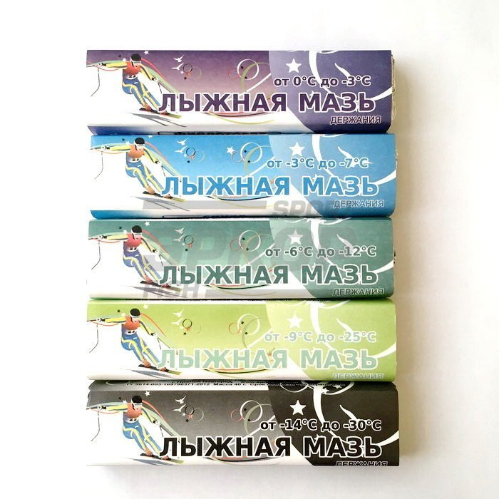 Характеристики и применение лыжных мазей, парафинов. Мази типа 1 делятся на 5 видов, имеют полутвердую и твердую консистенцию, применяемых при температуре воздуха: 1.От 0°С до -2°С (фиолетовая). Полутвёрдая. На старый и новый снег. 2.От -2°С до -8°С (синяя). Твёрдая. На старый и новый снег. 3.От -5°С до -12°С (зелёная). Твёрдая. На старый и новый снег. 4. От -10°С до -25°С (светло-зелёная). Твёрдая. На старый и новый снег. 5.От -15°С до -30°С (чёрная). Твёрдая. На очень холодный порошкообразный снег. ПРИМЕНЕНИЕ: Мази наносят тонкими слоями на чистую и сухую скользящую поверхность и тщательно растирают (если лыжи новые, то их предварительно необходимо просмолить лыжной смолой). Полутвёрдые мази разглаживают при помощи утюжка. Твёрдые мази при старом снеге разравнивают пробкой(послойно), при свежем снеге разравнивают тёплым утюжком. После смазки лыжи выносят на воздух и охлаждают в течение 20-30 минут.