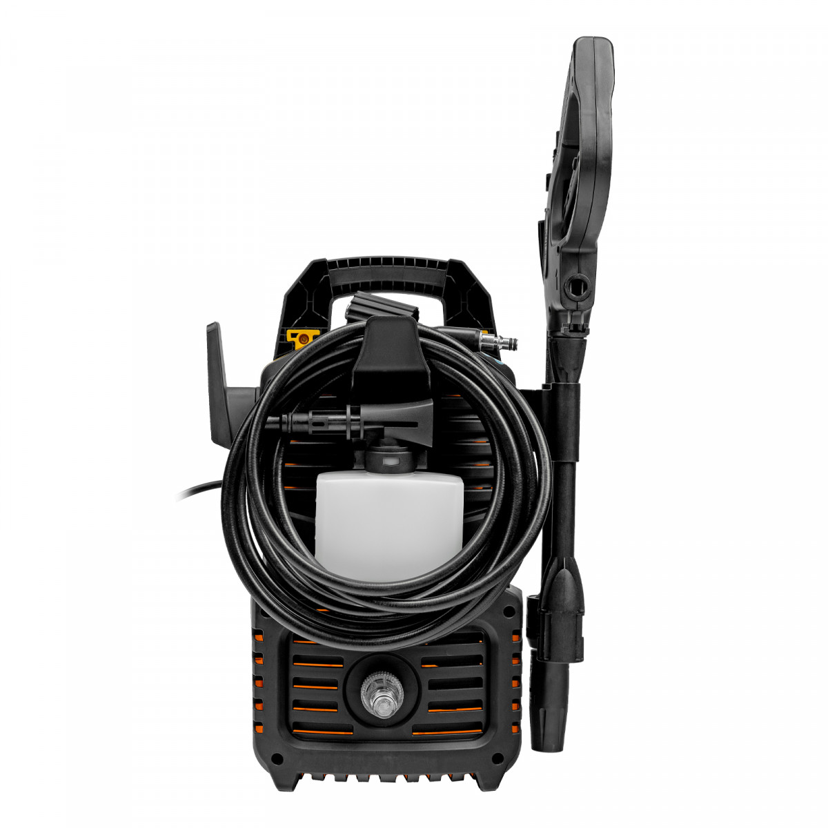 • Продуманная конструкция — кронштейны для шнура питания и шланга высокого давления, а также держатель для пистолета обеспечивают удобство хранения.
