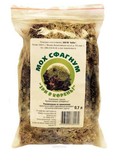 Мох сфагнум «Зри в Корень» – полностью натуральный материал, используемый для мульчирования почвы. Его главные свойства – хорошая водопроницаемость, воздухопроницаемость и антибактериальные свойства. Его нужно добавлять к растениям, которые требуют вышеперечисленных свойств почвы. Количество мха варьируется от типа растения и его почвы. Мох является безвредным для человека. Храните его в теплом месте, защищенным от солнечных лучей.