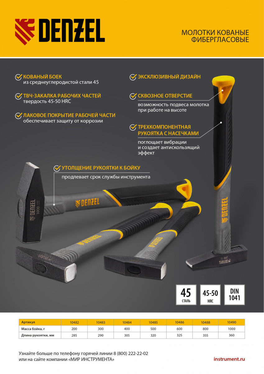 Молоток слесарный кованый Denzel 10483 с квадратным бойком весом 300 г и трехкомпонентной фибергласовой рукояткой с TPR-покрытием предназначен для работы с металлическими заготовками, забивания гвоздей, штырей, дюбелей и другого крепежа. Рукоятка выполнена в эксклюзивном дизайне. Молоток рекомендован для профессионального и домашнего применения.