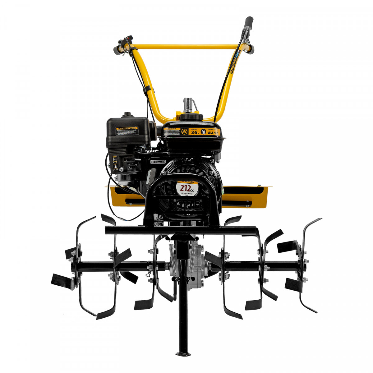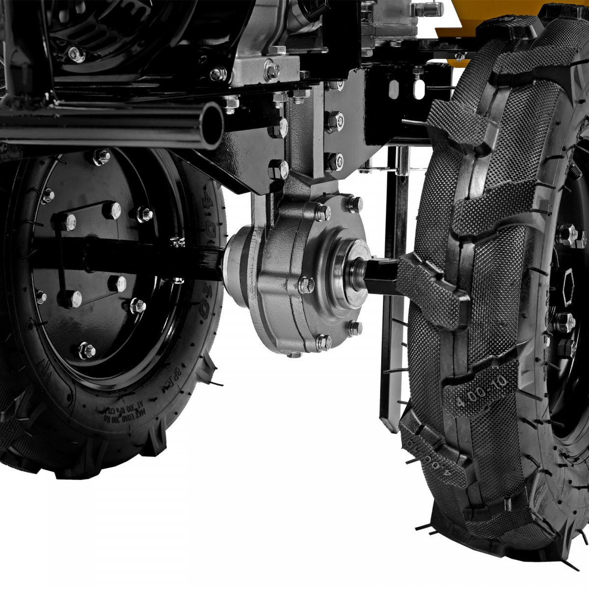 • Комфортная транспортировка — усиленная рукоятка-бампер и большие колеса с глубоким протектором позволяют с легкостью перемещать мотоблок до нужного места.