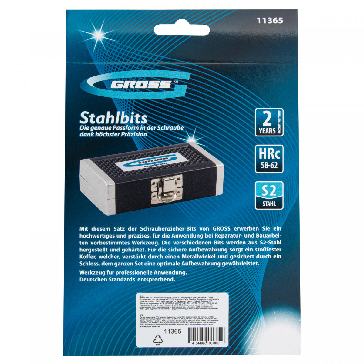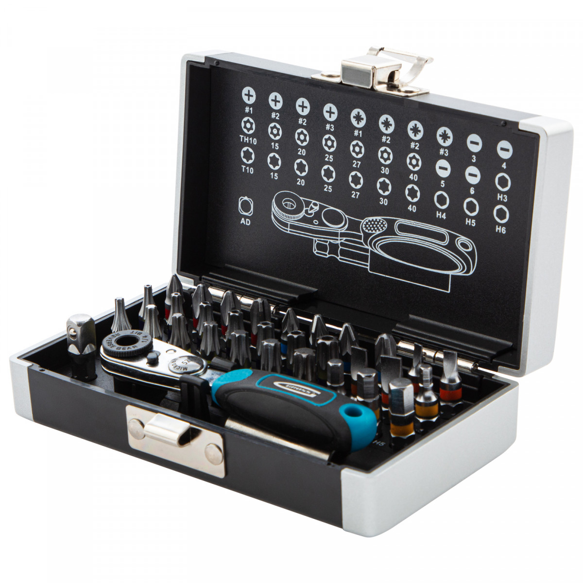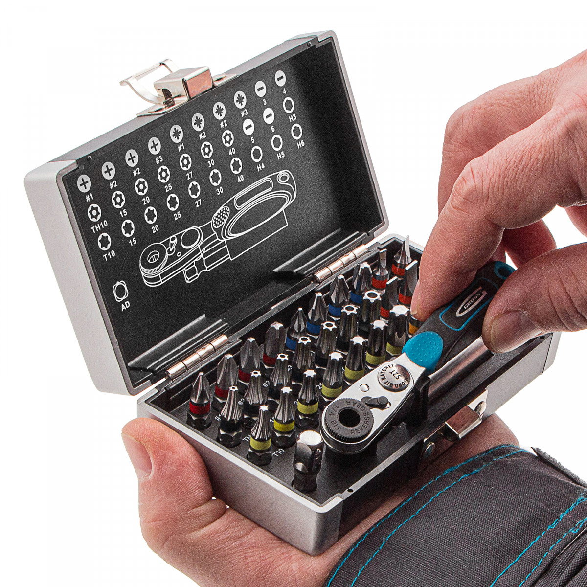 Набор бит с магнитным держателем Gross 11365 с присоединительным размером 1/4 дюйма, 33 предмета из стали S2 в пластиковом кейсе, предназначен для сборки мебели, велосипедов, бытовых приборов, для технического обслуживания автомобилей и прочих монтажных, строительных и слесарных работ. В комплекте подобраны 30 бит самых ходовых типоразмеров, компактный ключ-трещотка с 52 зубьями, магнитный адаптер для бит, а также переходник для использования торцевых головок.