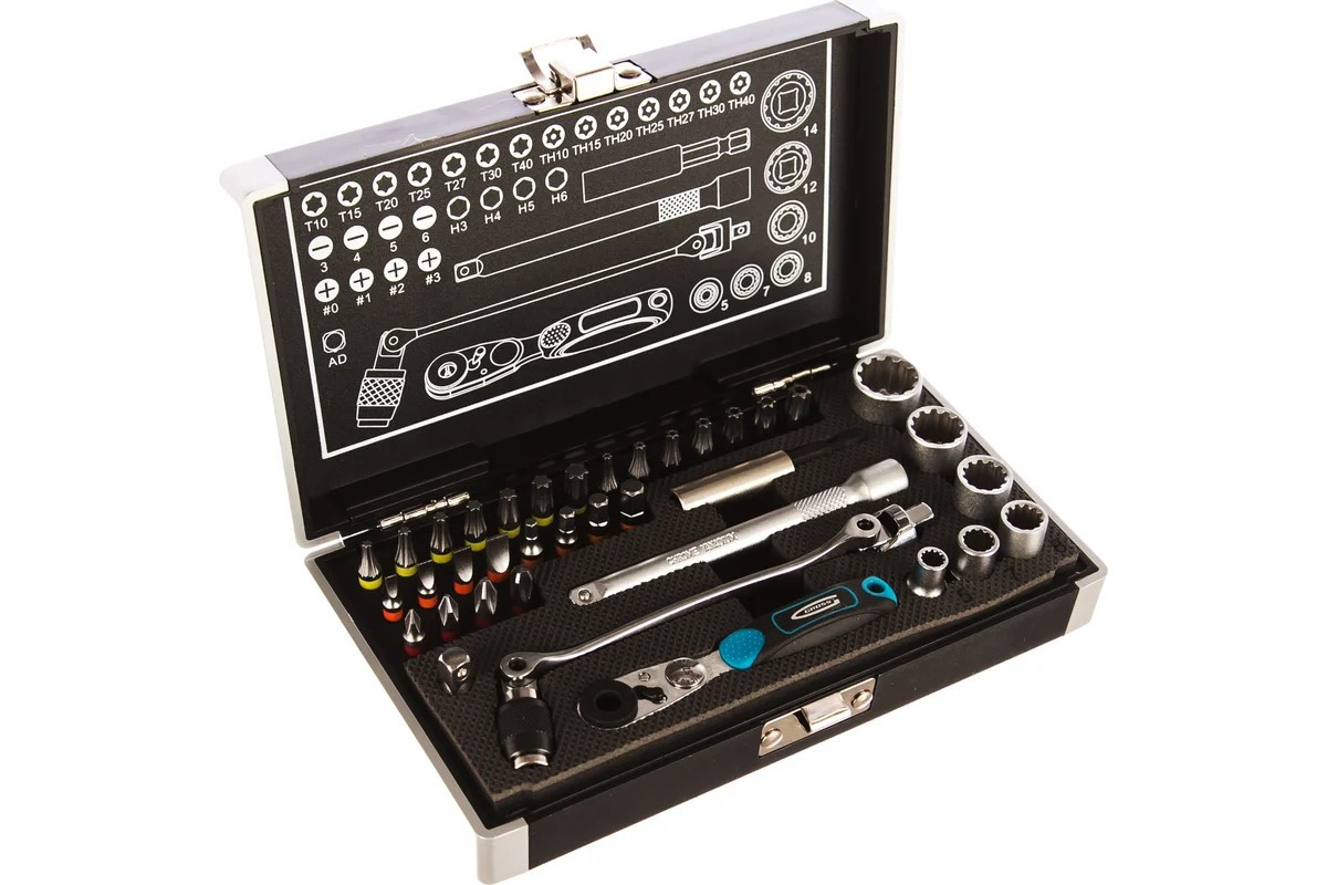 Набор Gross подходит для широкого спектра слесарно-монтажных работ, т.к. включает в ctmz 37 предметов: трещотку, адаптер, карданный ключ, торцевые головки и биты с хвостовиком 1/4". Он может использоваться в домашних условиях, на мебельном производстве и т.д.