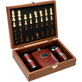 Подарочный набор в деревянном чемодане. Чемодан сделан из лакированного дерева, внутри бархатная подложка. Чемодан закрывается на защелки, имеет удобную ручку. В крышке расположен набор для игры в шахматы. На крышке изображена шахматная доска. В набор также входят фляжка, четыре стопки, нож-штопор, воронка. Фляжка и стопки выполнены из нержавеющей стали, декорированы искуственной кожей. Фляжка украшена металлической пластиной "Герб России".