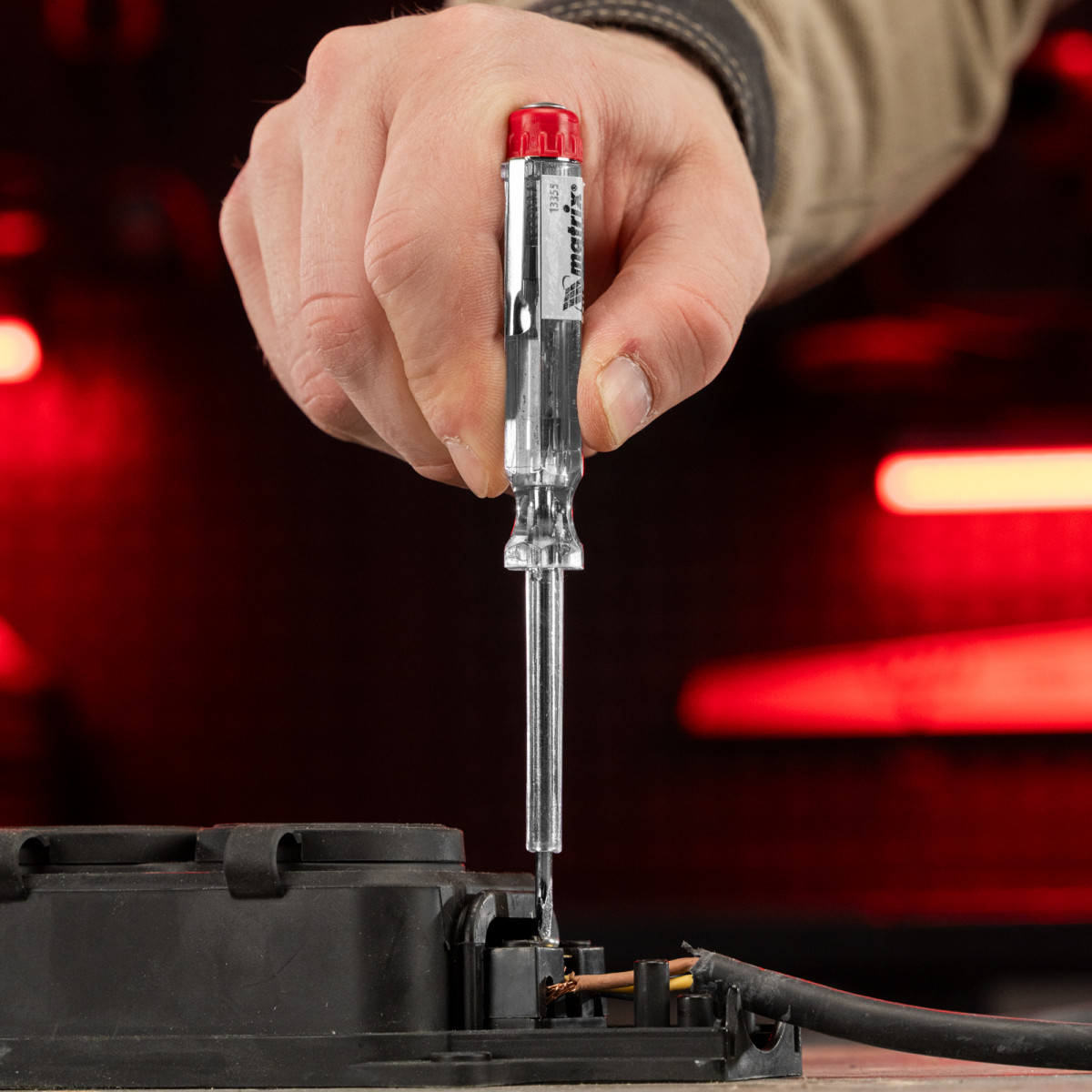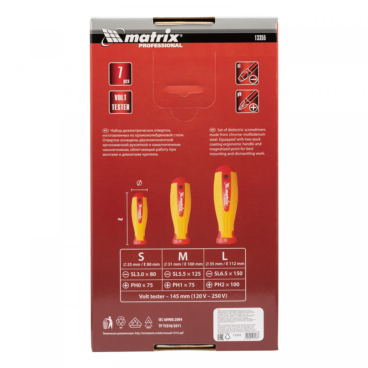 Набор диэлектрических отверток Matrix 13355 состоит из 7 предметов: 6 отверток с двухкомпонентными рукоятками, выдерживающих напряжение до 1000 В, и тестера до 250 В. Предназначен для проведения электромонтажных работ. Отвертки полностью покрыты изолирующим материалом, защищающим мастера от поражения электрическим током. Подходят для шлицев SL и PH. Входящий в комплект тестер позволяет быстро определить наличие напряжения в сети. Набор рекомендован для профессионального применения.,Важно — перед выполнением работ следует обесточить сеть либо отключить от нее прибор!