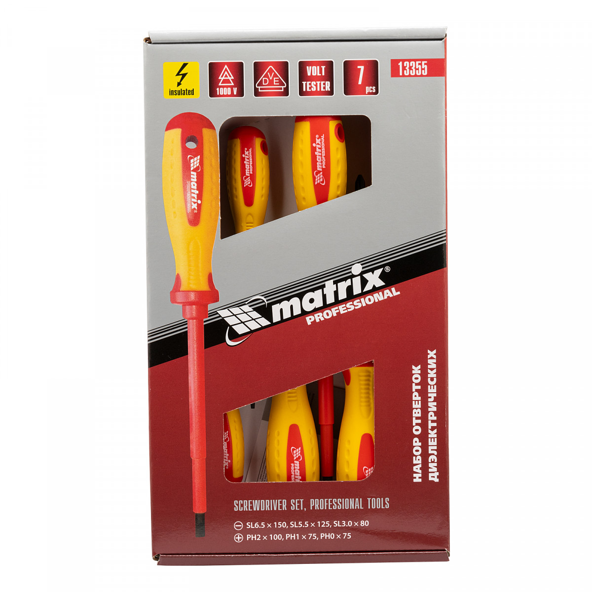 Набор диэлектрических отверток 7 шт, до 1000 В, пробник электрический до 250 В, двухкомпонентные рукоятки Matrix Professional
