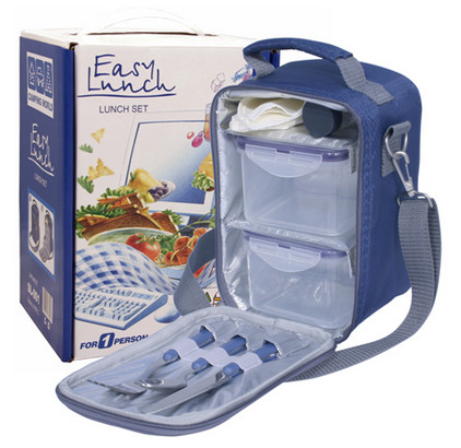 Лучший подарок для сотрудника офиса (а еще для современного супер-занятого школьника)! Ланч бокс «Easy Lunch» поможет сохранить горячими, свежими и аппетитными с утра и до обеда два любимых блюда (первое и второе). Сумка ланч бокса состоит из двух отделений, и является изотермической. В каждом из отделений очень уютно себя чувствуют два пищевых контейнера. Ланч бокс «Easy Lunch» дает возможность красиво пообедать – в комплект входят столовые приборы, тканевая салфетка и универсальная солонка-перечница! И главное – ланч бокс является прекрасным подарком и упакован в красивую коробочку! Материал: Полиэстер. Размер (ДхШхВ), см: 17х24х15. Страна-производитель: Россия (Китай). Цвет: синий. Количество персон: 1. Изотермическое отделение для продуктов: есть. В комплекте: 2 пищевых контейнера, 1 солонка/перечница, 1 нож, 1 вилка, 1 столовая ложка, 1 салфетка, 1 изотермическая сумка. Размеры контейнеров (В*Д*Г): 8*10*10 см.