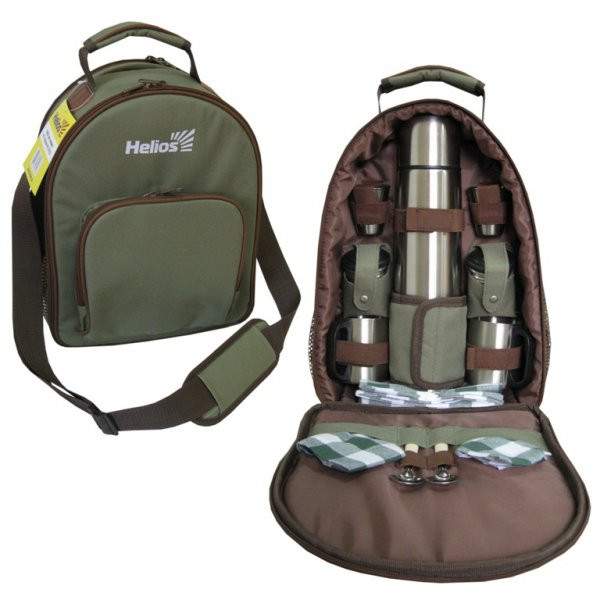 Удобный и компактный набор на 2 персоны включает все необходимое для отличного пикника на свежем воздухе: 1 термос (1л), 2 кружки с пластиковой ручкой, набор для сахара и чая, 2 чайные ложечки, 2 стопки, 2 салфетки.Материал: Полиэстер 600 D.