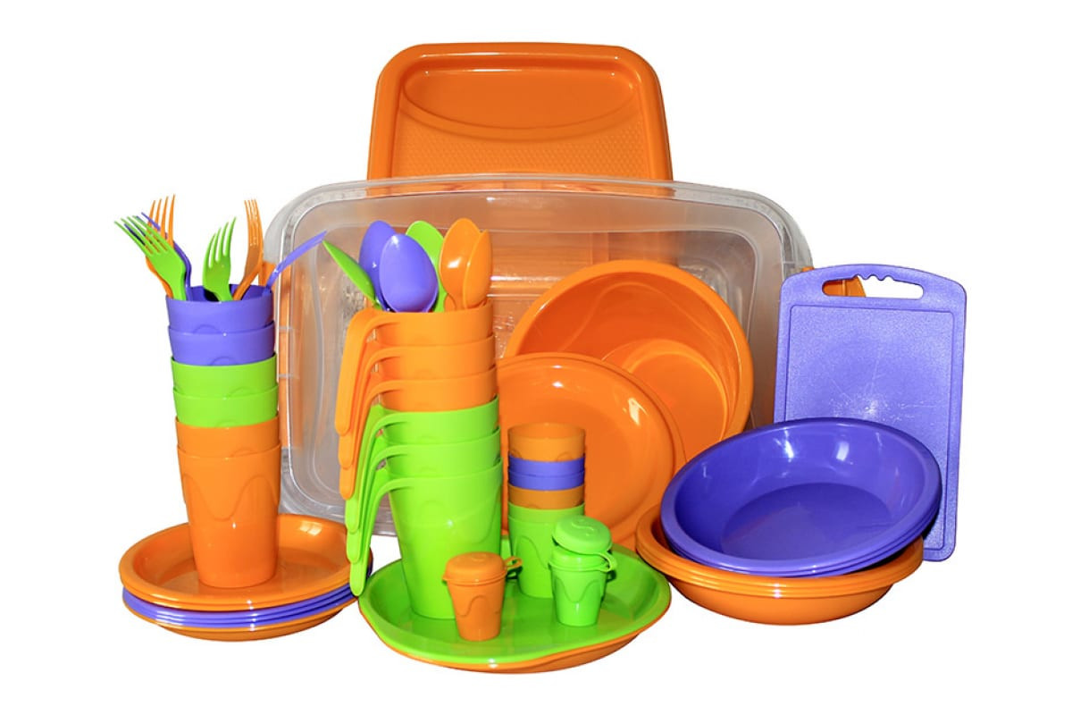 Вся посуда и приборы выполнены из высококачественного пищевого пластика. Набор имеет небольшой вес, благодаря чему его легко транспортировать. Поставляется в контейнере объемом 16 литров.