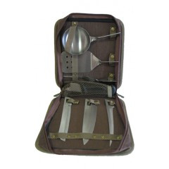 Отличный подарочный набор для походной кухни пригодится тем, кто любит готовить на природе, в походных условиях. В комплекте - шесть необходимых приборов с двумя съемными ручками. Все приборы выполнены из высококачественной нержавеющей стали. Сменные ручки легко крепятся к любому из приборов. Ручек две, что позволяет использовать два прибора одновременно. Для удобства набор упакован в матерчатый чехол на молнии с ручкой. С такой «кухней» вам будет проще радовать друзей и близких настоящим походным кушаньем!