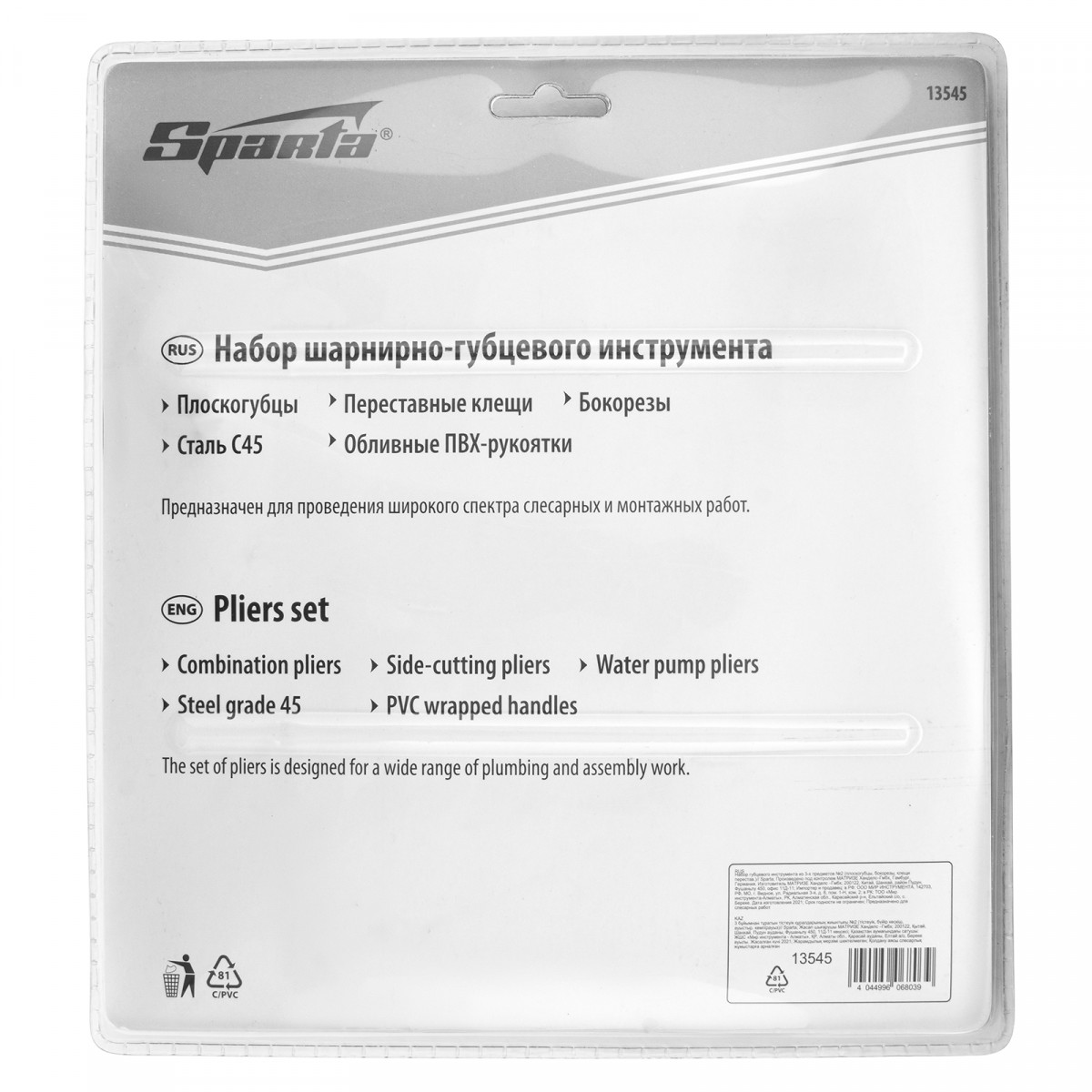 Набор губцевого инструмента №2, 3 предмета: плоскогубцы, бокорезы, клещи переставные Sparta
