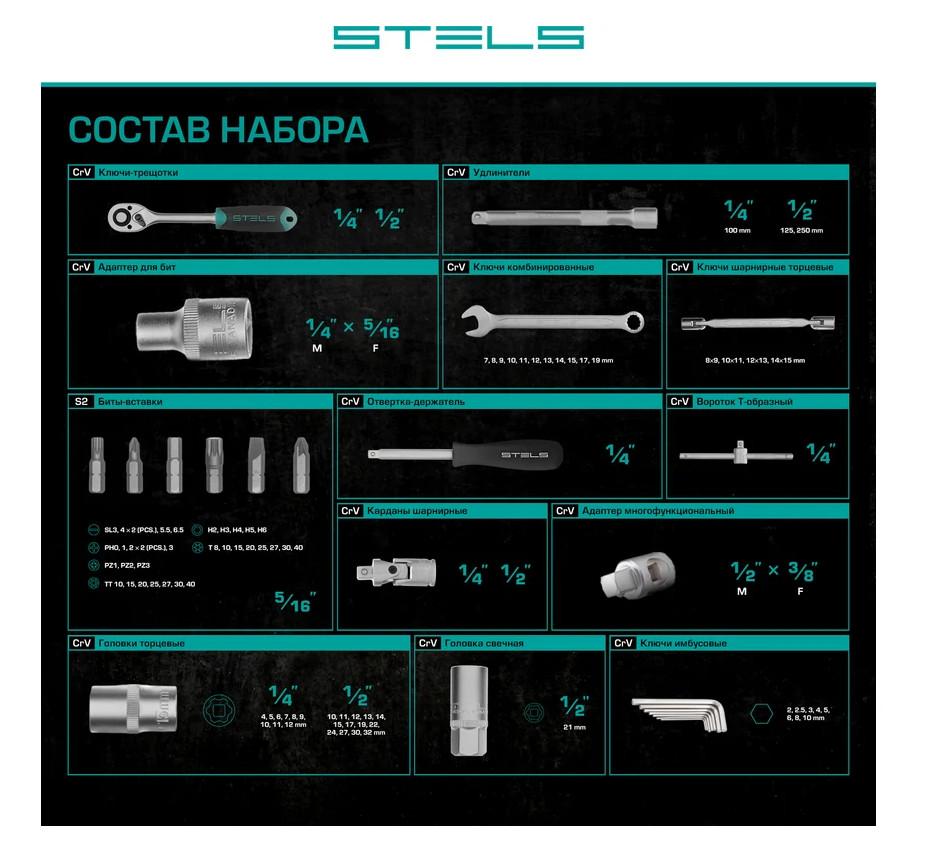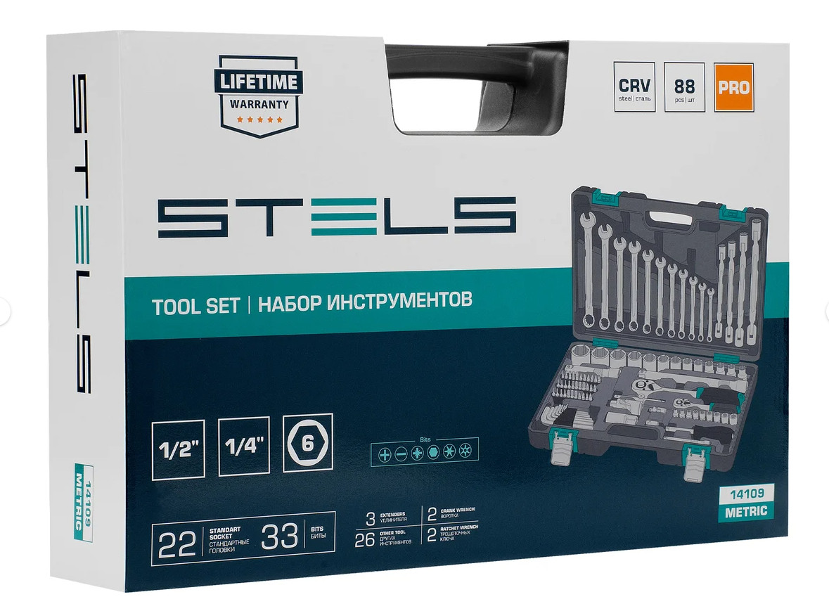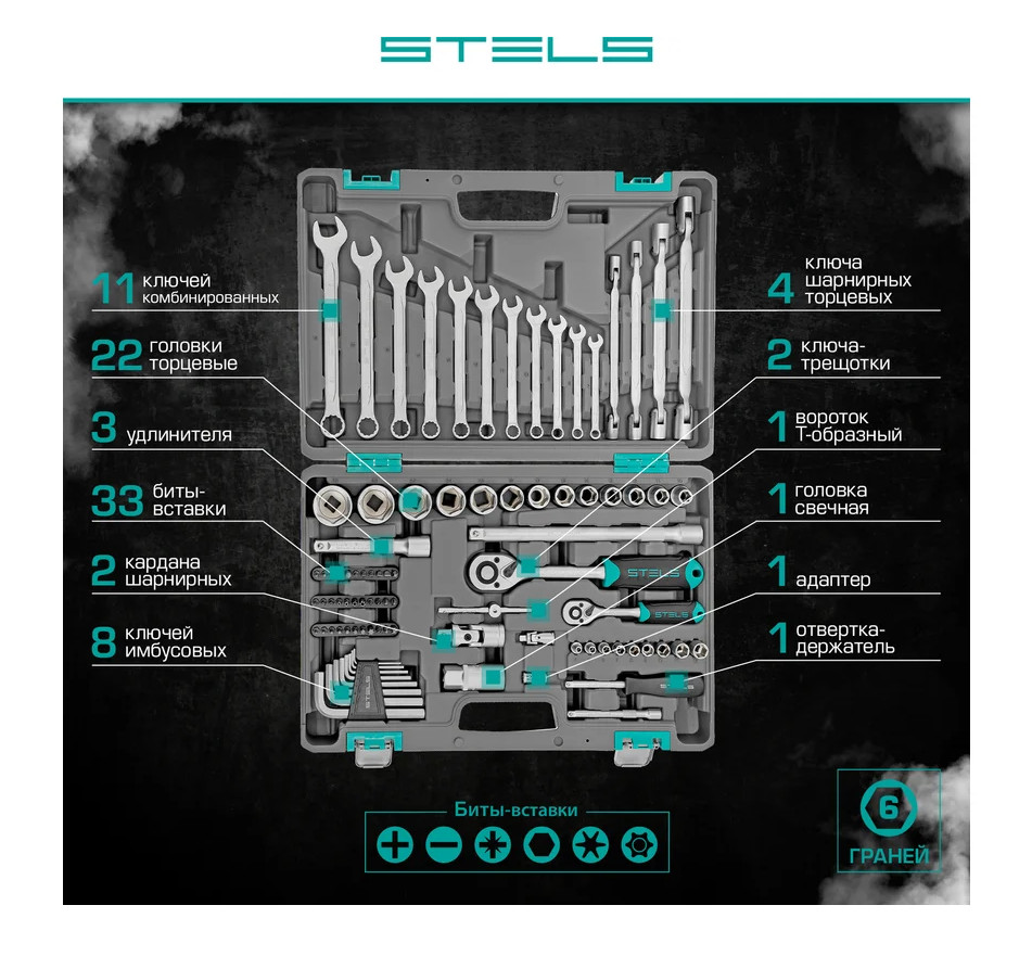 Наборы инструмента торговой марки STELS разработаны специально для автолюбителей и центров технического обслуживания. Каждый этап производства контролируется в соответствии с международными стандартами. Головки и комбинированные ключи изготовлены из хромованадиевой стали, придающей инструменту исключительную твердость в сочетании с легкостью. Биты, биты-вставки и отвёртки производятся из стали S2, улучшающей свойства инструмента. Все наборы упакованы в кейс, изготовленный из жесткого противоударного пластика, с металлическими застёжками. Наборы инструмента STELS пригодятся вам не только в автомобиле. С их помощью можно проводить бытовой ремонт дома и на даче, ремонт бытовых конструкций и садовой техники.