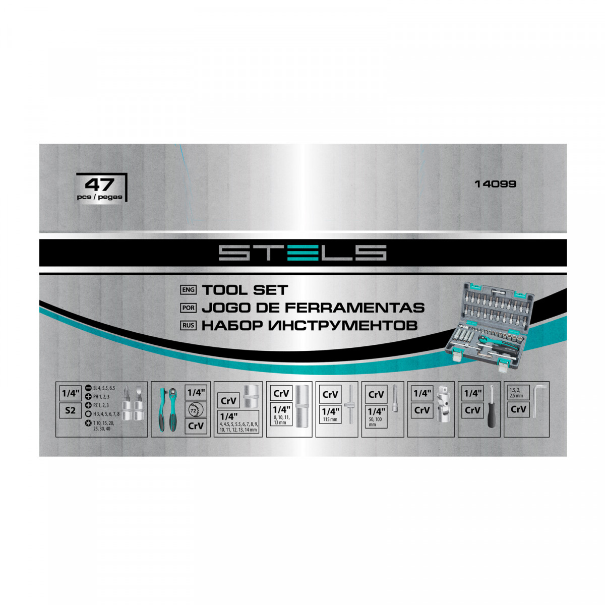 Набор инструментов Stels 14099 в ударопрочным пластиковом кейсе состоит из 47 предметов с присоединительным квадратом 1/4″, из стали CrV и S2, и предназначен для выполнения слесарно-монтажных работ. Включает инструменты и насадки для работы с резьбовыми крепежами, а также удлинители и т-образный вороток, облегчающие работу в труднодоступных местах. Набор предназначен для профессионального использования в автомастерской, будет полезен и для решения бытовых задач.