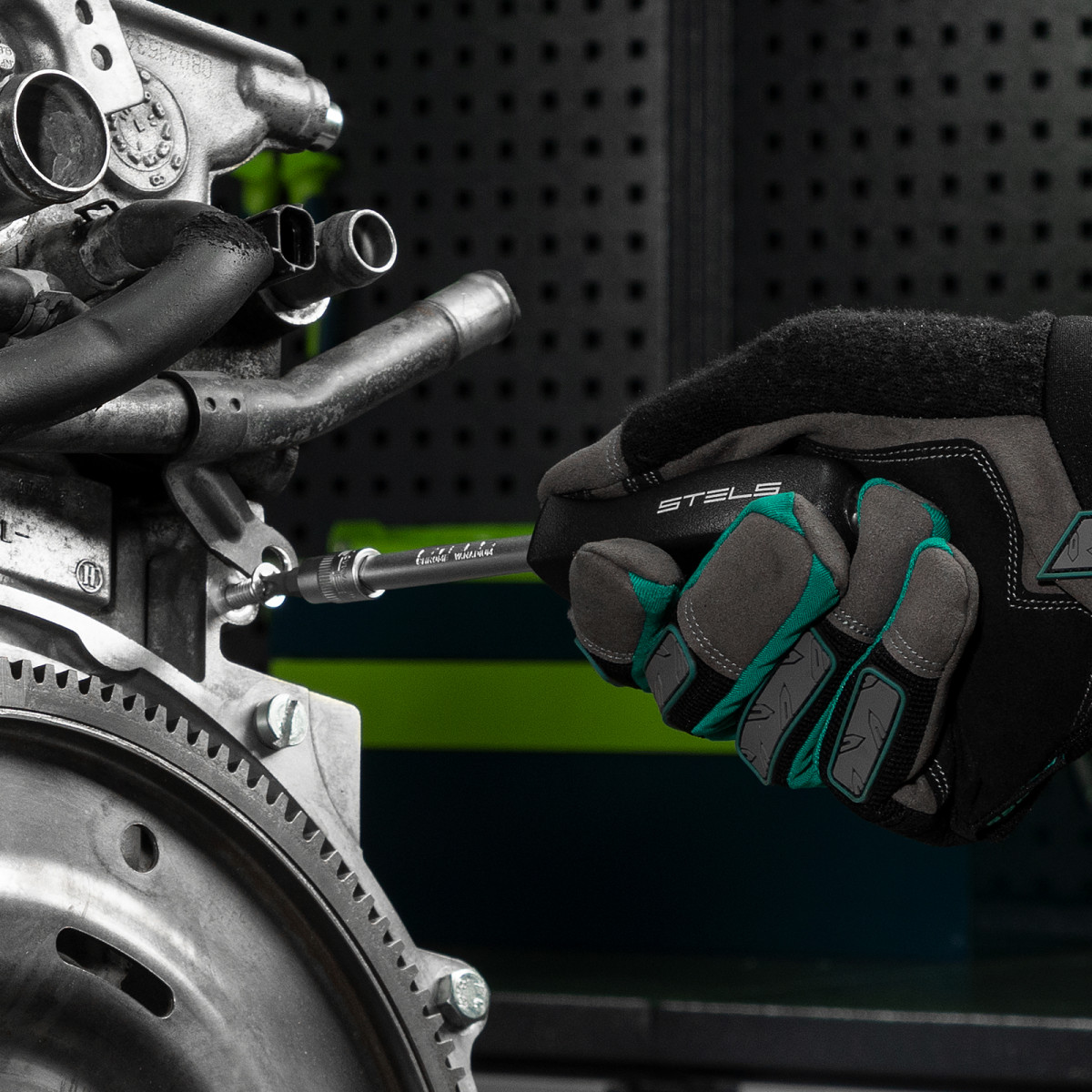 - Защита от разрушения — антикоррозийное покрытие "матовый хром" предотвращает появление ржавчины, а рукоятка трещотки из полипропилена и резины устойчива к воздействию бензина и масла.