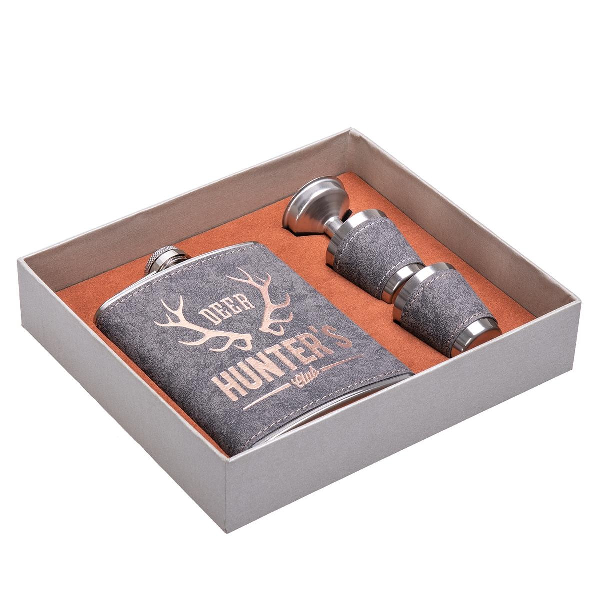 В подарочный набор "Клуб Охотников" входит: фляжка (240 мл) декорированная тисненым рисунком в виде головы оленяи надписи, 2 стопки и воронка. Материал: нержавеющая сталь