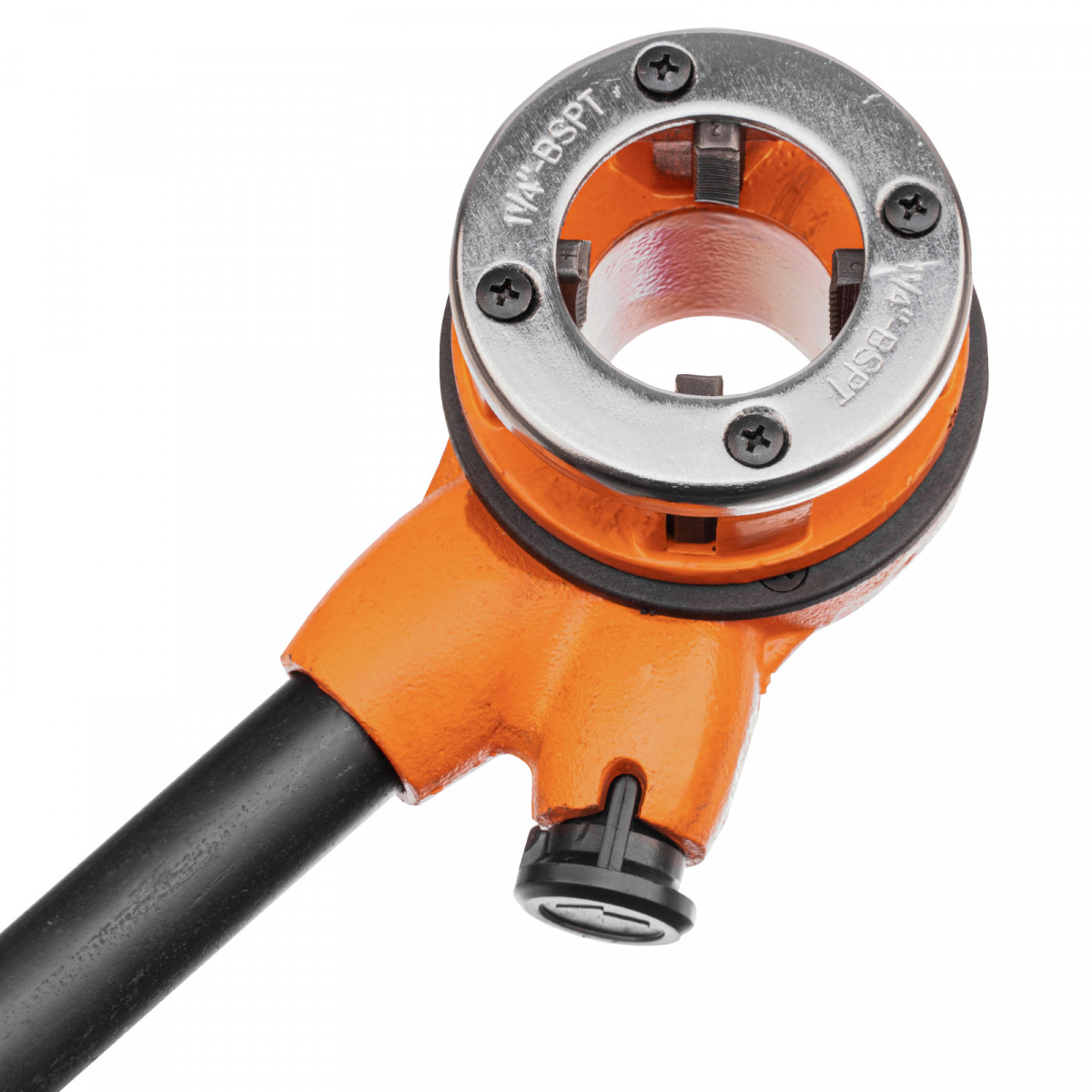Набор Sparta 773355 включает в себя 9 предметов: клуппы наиболее востребованных размеров 1/4″, 3/8″, 1/2″, 3/4″, 1″ и 1 1/4″, а также плашкодержатель с трещоткой и удлинителем. Пригодится частному мастеру для нарезания внешней резьбы на новых трубах или ремонта старых. Плашкодержатель оснащен трещоточным механизмом, который наиболее эффективно передает рабочее усилие, а также позволяет работать в труднодоступных местах.