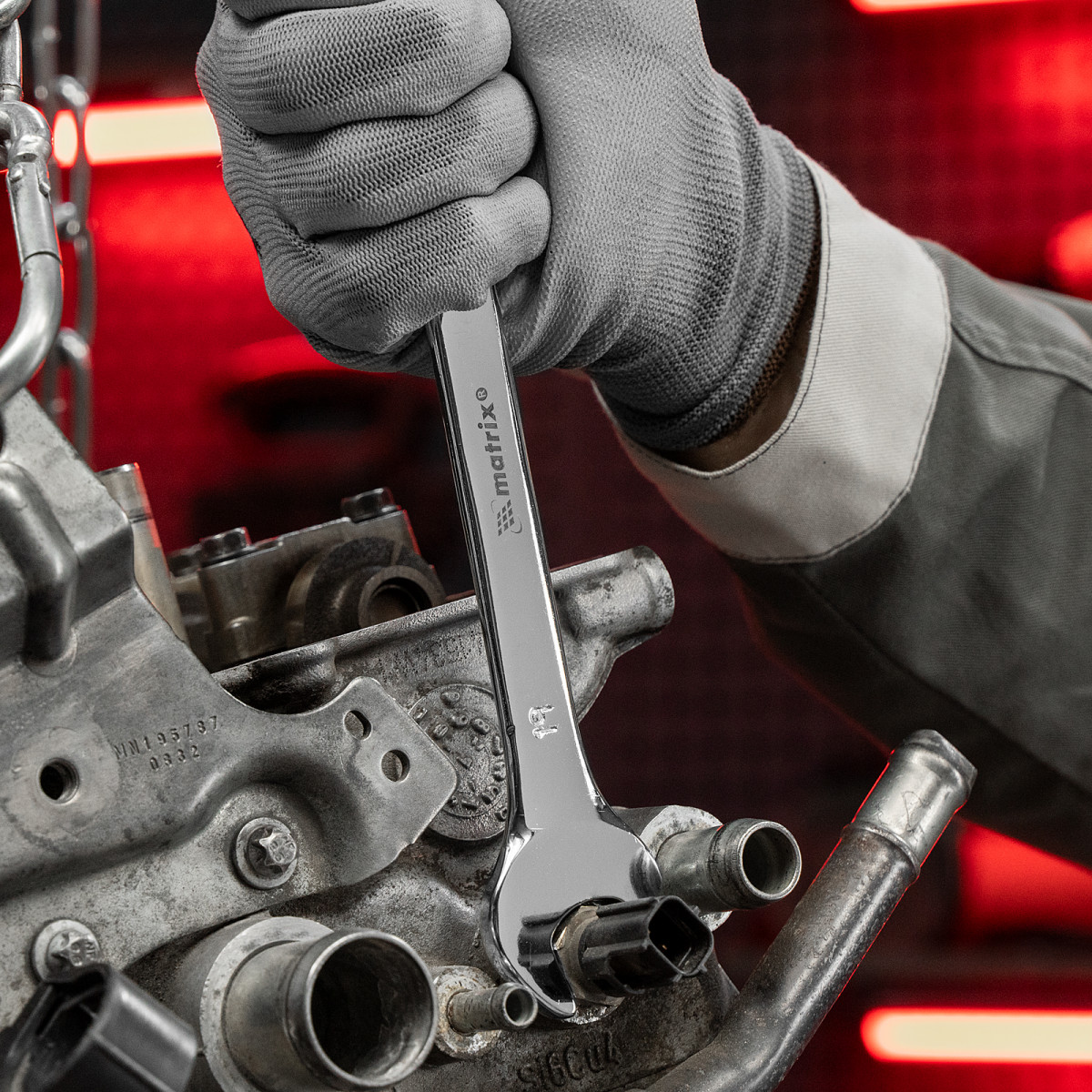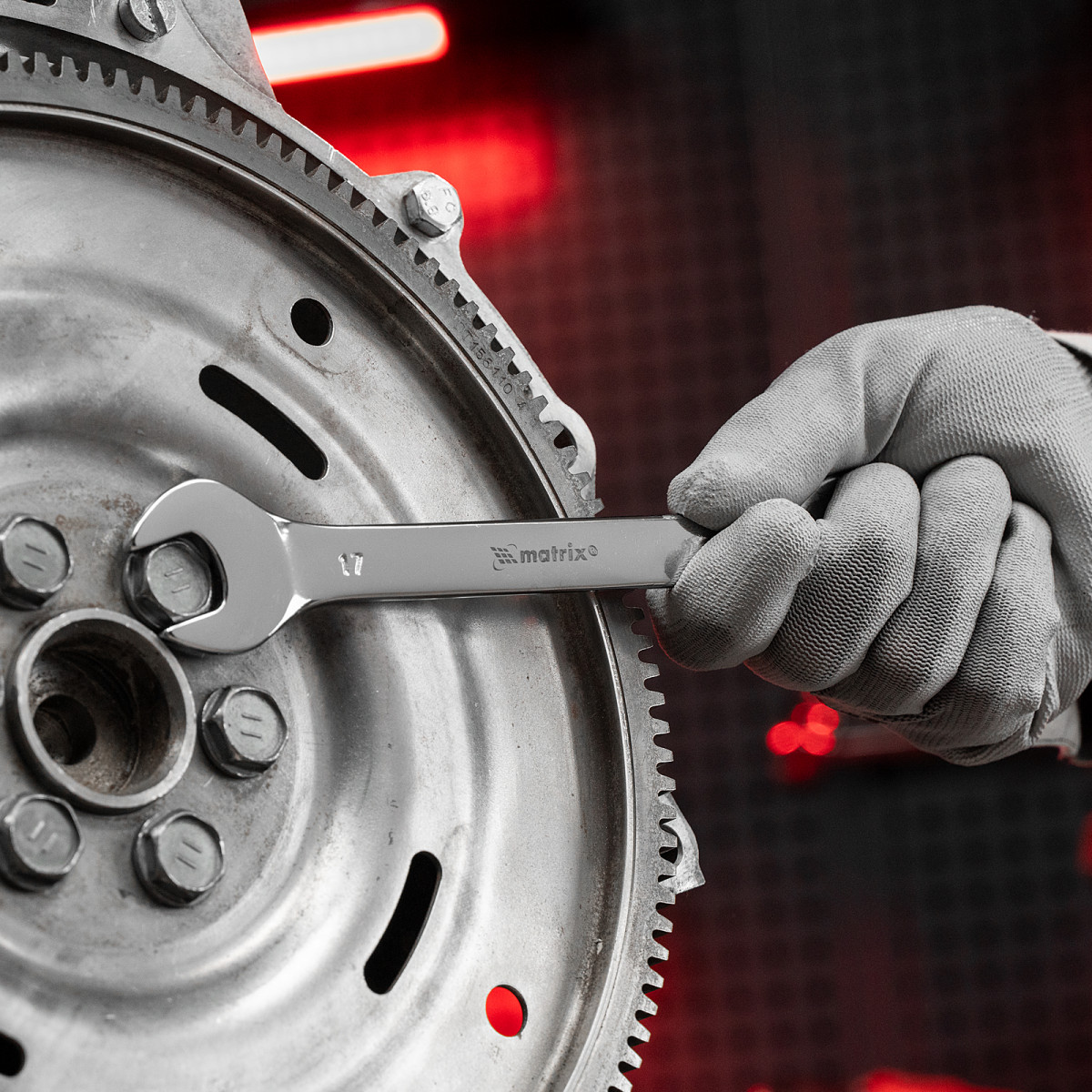 Набор Matrix Elliptical 15242 включает в себя 12 рожковых ключей из стали CrV с зеркальным хромированием и предназначен для закручивания и откручивания резьбовых соединений с шестигранным профилем и размером головки от 6 до 32 мм. Ключи удобны для манипуляций в ограниченном пространстве, т. к. у каждого из них губки расположены под углом к рукоятке. Набор будет полезен при проведении монтажных, сантехнических работ, для ремонта автомобилей или бытовой техники, также пригодится в быту.