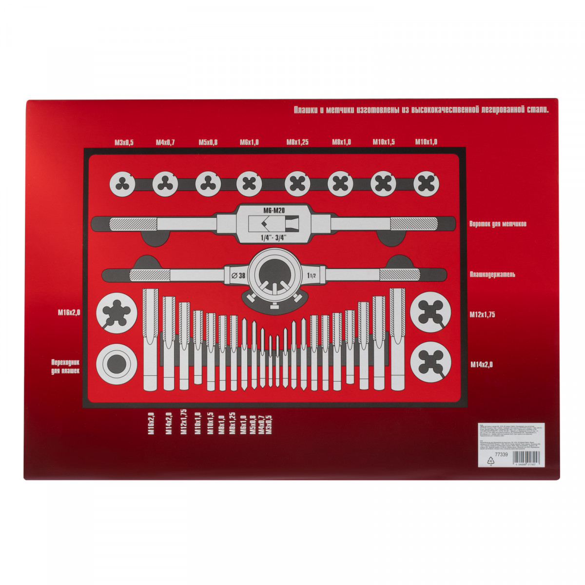 Набор метчиков и плашек М3-М16 Matrix 77339 состоит из 36 предметов — резьбонарезных инструментов, воротка и плашкодержателя с переходником. Используется для создания наружной и внутренней резьбы в сквозных и глухих отверстиях металлических деталей. Также с его помощью можно восстанавливать поврежденные резьбовые участки. Набор поставляется в металлическом кейсе, поэтому не потеряется при хранении или транспортировке. Будет полезен в слесарной мастерской, а также пригодится для проведения бытового ремонта.