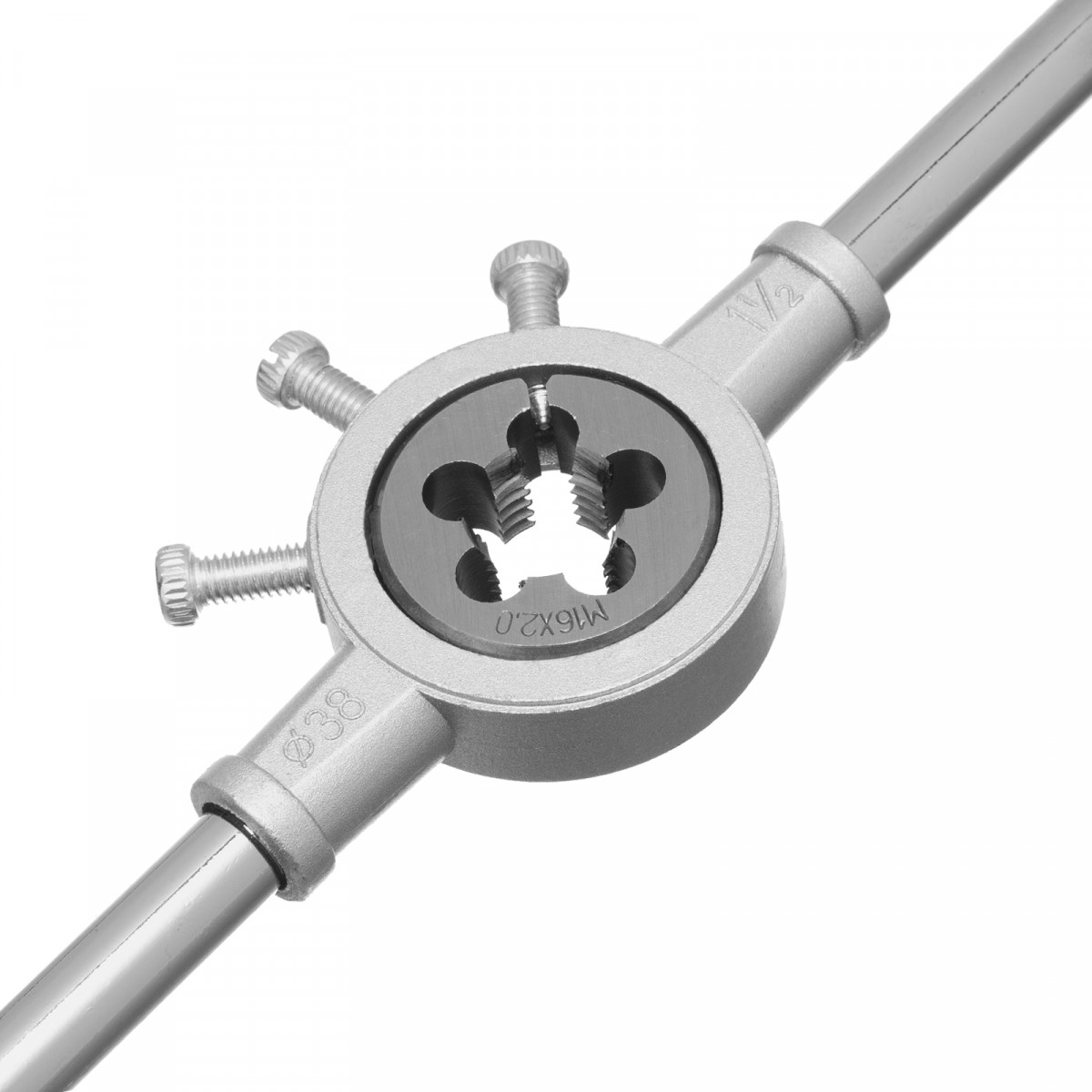 - Комфортная и эффективная работа — плашку удерживают в держателе боковые винты, метчик крепко фиксируется в воротке посредством регулируемого винтового механизма.