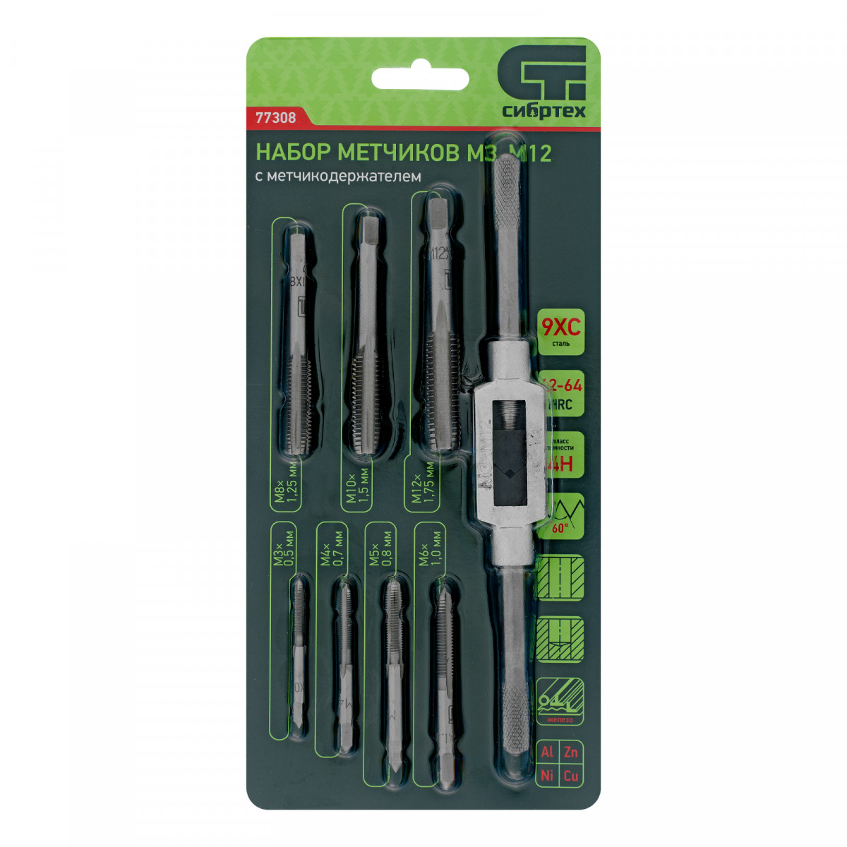 Набор метчиков М3-М12 Сибртех 77308 состоит из 8 предметов — метчикодержателя и метчиков, позволяющих вручную нарезать внутреннюю резьбу в сквозных и глухих отверстиях. Оптимален для работы с цветными металлами. Набор будет полезен при ремонте оборудования, автомобилей, а также пригодится в быту.