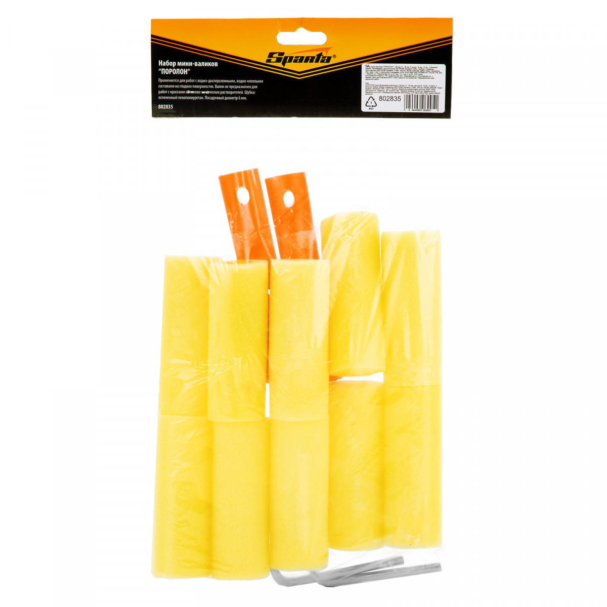 Набор мини-валиков Sparta «Поролон» 802835 включает 10 роликов шириной 100 мм и диаметром 35 мм, а также 2 бюгеля диаметром 6 мм. Он применяется для нанесения побелки, краски, лака, клеевого состава на водной основе. Набор оптимален для работы с небольшими гладкими поверхностями.
