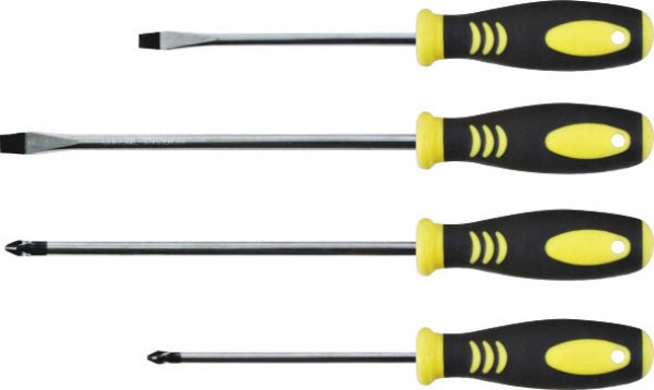 Набор 4 шт. Отвертки: РН1х100 мм, РН2х150 мм, SL5х100 мм, SL6х150 мм. Материал: жало из хром-ванадиевой стали, магнитный наконечник, прорезиненная ручка. Упаковка: блистер.