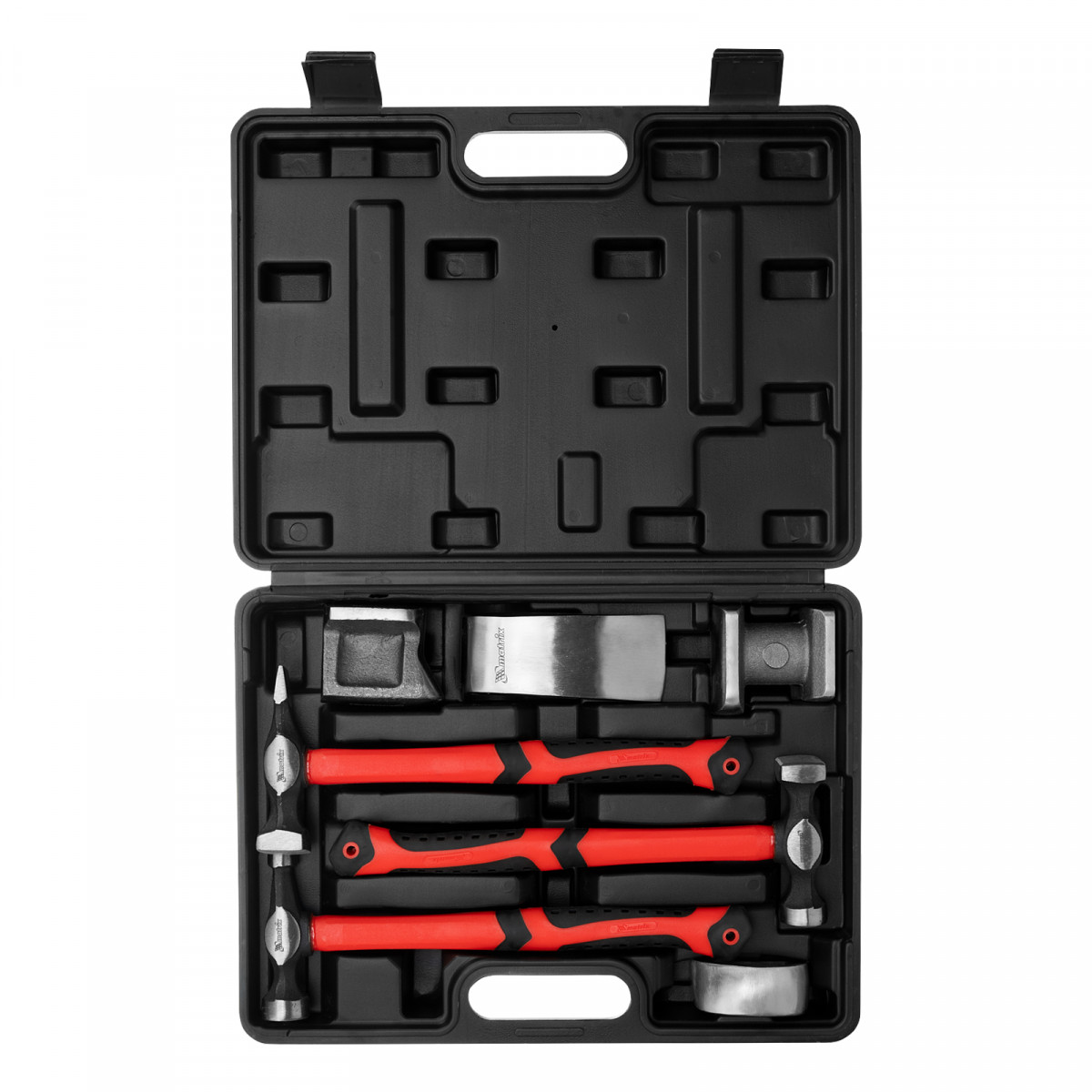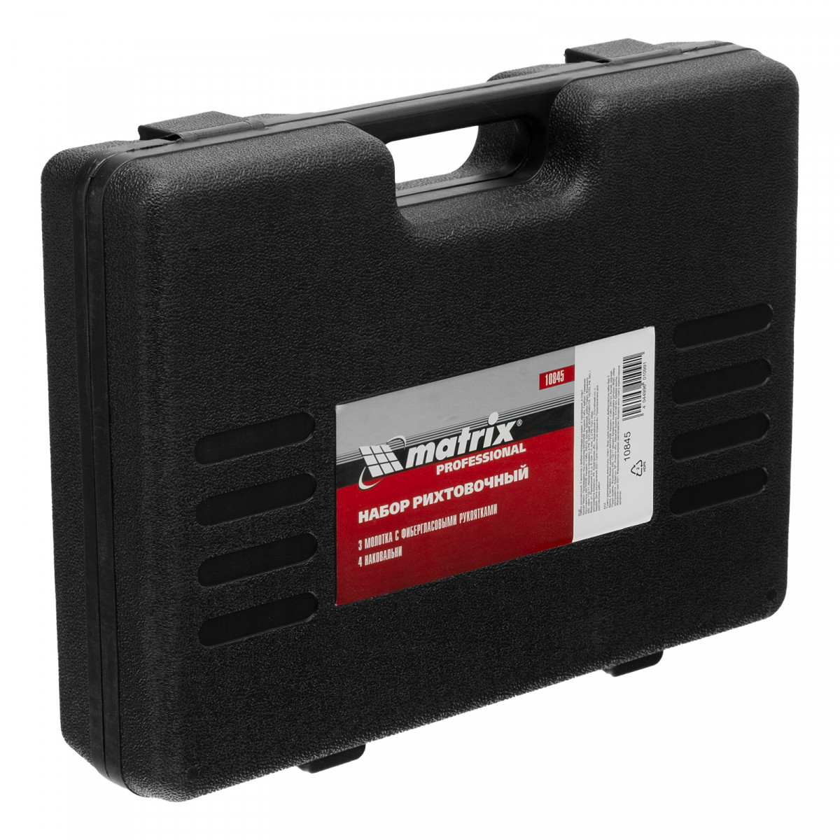 Рихтовочный набор Matrix 10845, включающий 3 молотка с фибергласовыми ручками и 4 наковальни, предназначен для исправления геометрии элементов автомобильного кузова. Наковальни и ударные головки имеют различную форму, что позволяет работать с деталями разной степени кривизны. Набор используется в автомастерских.