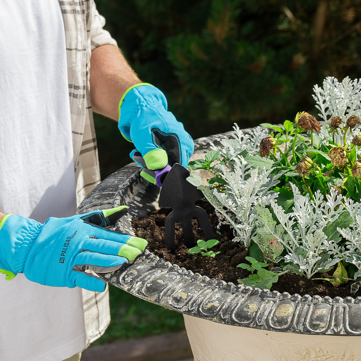 • Эргономичность — пластиковые ручки совка и мотыжки имеют рифленую поверхность и не выскальзывают из ладони, рукоятки секатора с подпальцевыми выемками обеспечивают надежный хват.