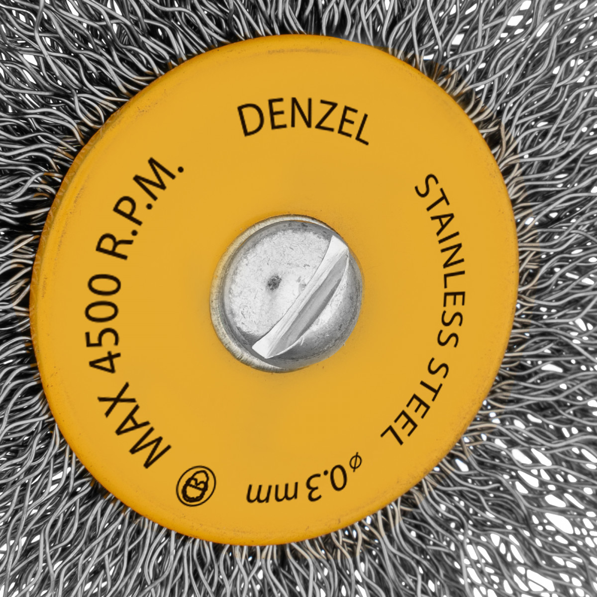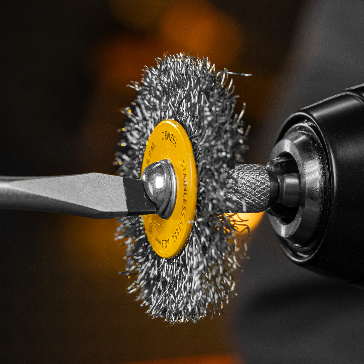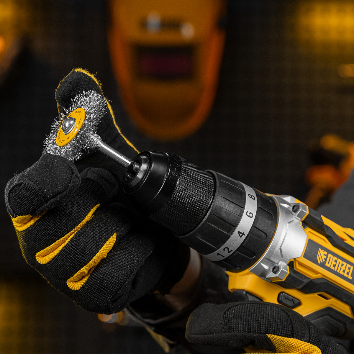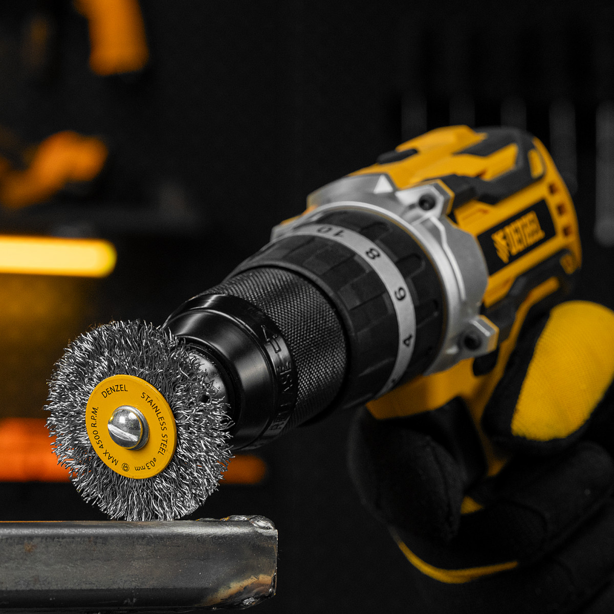 Набор щеток для дрели, 5 Плоских 25-38-50-63-75 мм, шпилька, нерж. вит. проволока Denzel