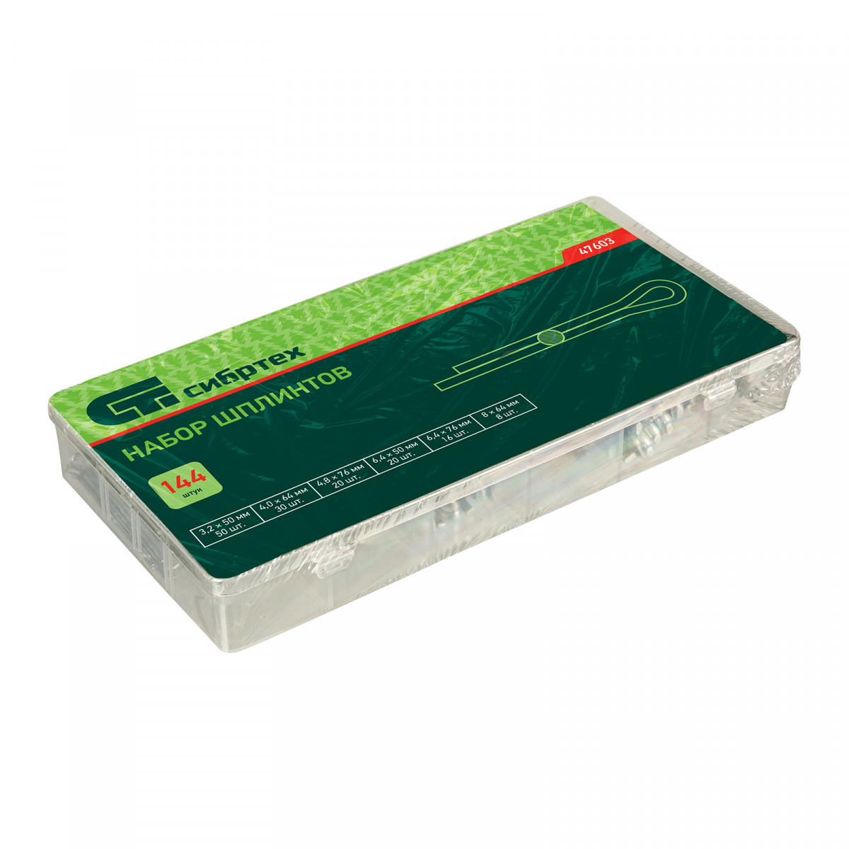 Набор шплинтов, S головки х L: 3.2 х 50.4 х 64, 4.8 х 76, 6, 4 х 25, 6, 4 х 76, 8 х 64 мм, 144 предмета Сибртех