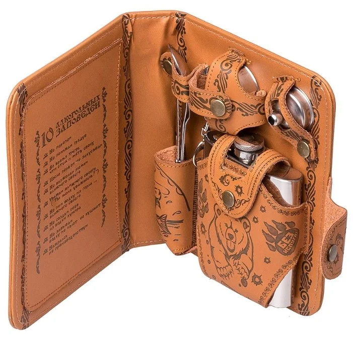 Подарочный набор. Сумка, из искусственной кожи, в виде книжки, сверху и внутри на кожу нанесен красочный узор и рисунок. Предметы:фляжка, раскладной стакан, воронка, нож, вилка и ложка изготовлены из нержавеющей стали. В сумке предусмотрены специальные ремешки из искусственной кожи для фиксации предметов. Фляжка 210 мл.. Раскладной стакан. Воронка. Нож. Вилка. Ложка.